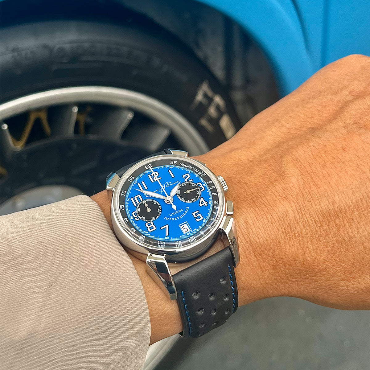Alojado numa caixa de aço inoxidável de 40 mm, este relógio adequa-se à maioria dos pulsos em especial os dos amantes de carros antigos.