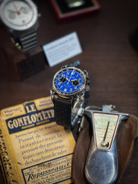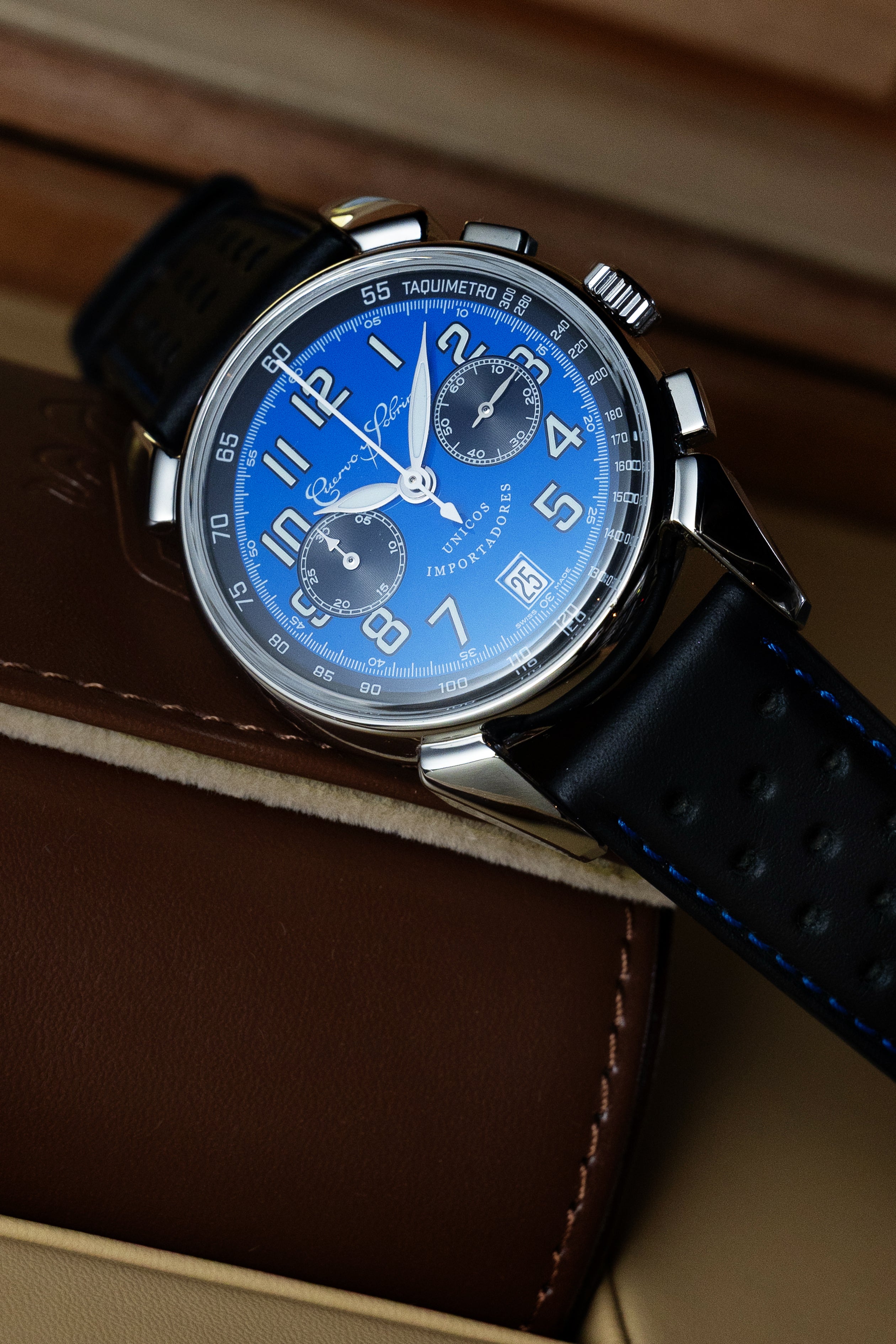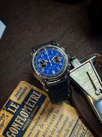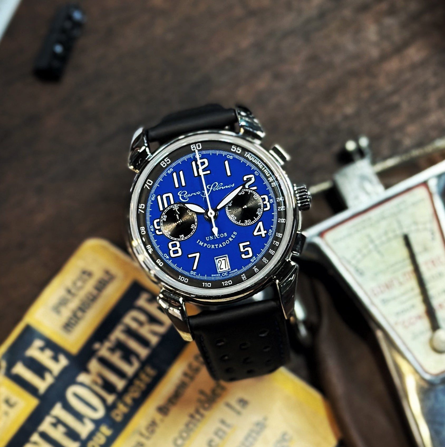 Mostrador azul com índices prateados e 2 contadores pretos