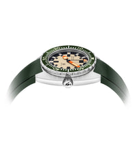 A caixa de 42,50 milímetros do DOXA Army, maquinada a partir de um bloco de aço inoxidável 316L, é coberta com um vidro de safira. A caixa e, portanto, o movimento que protege, é resistente a uma pressão de 30 ATM, equivalente a uma profundidade de 300 metros ou 984 pés. Este modelo de reedição apresenta uma luneta rotativa unidirecional em bronze - marcando a primeira vez que a DOXA usou este metal em suas coleções - com uma inserção de cerâmica verde caçador ou em aço inoxidável com uma inserção de cerâmica preta.