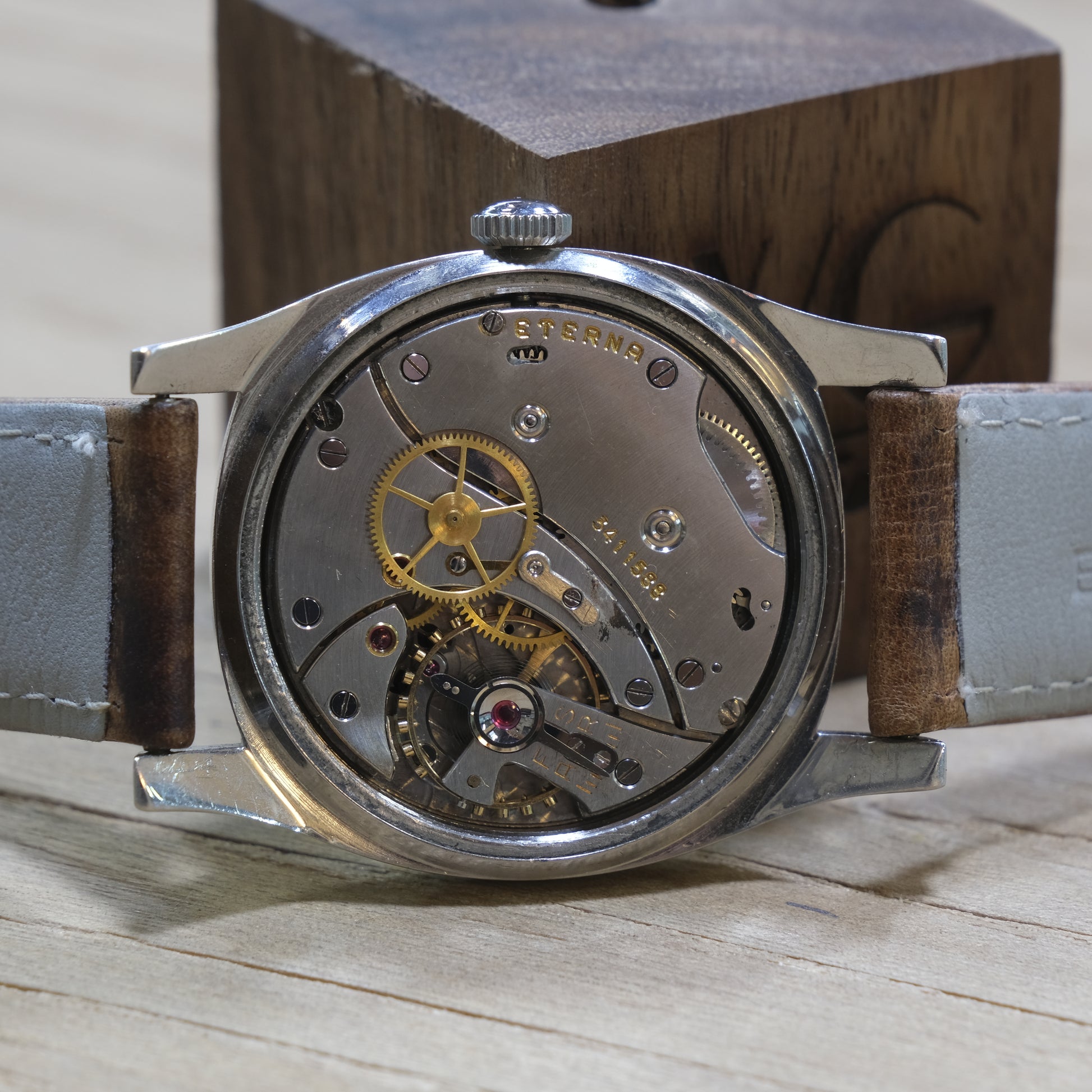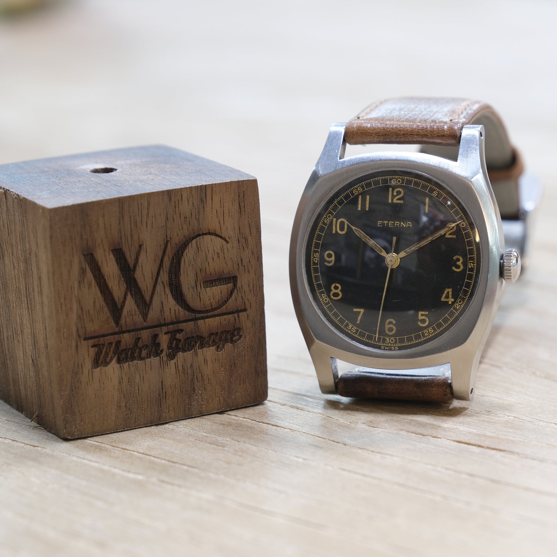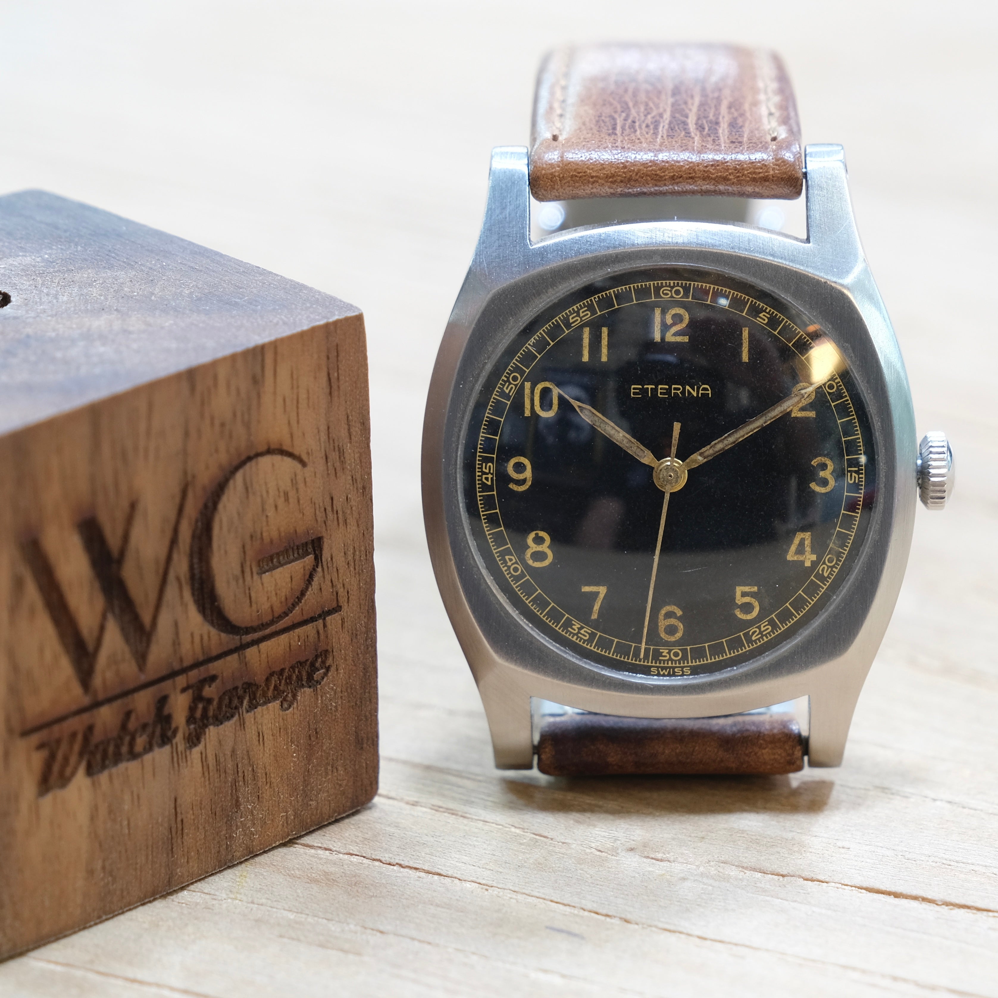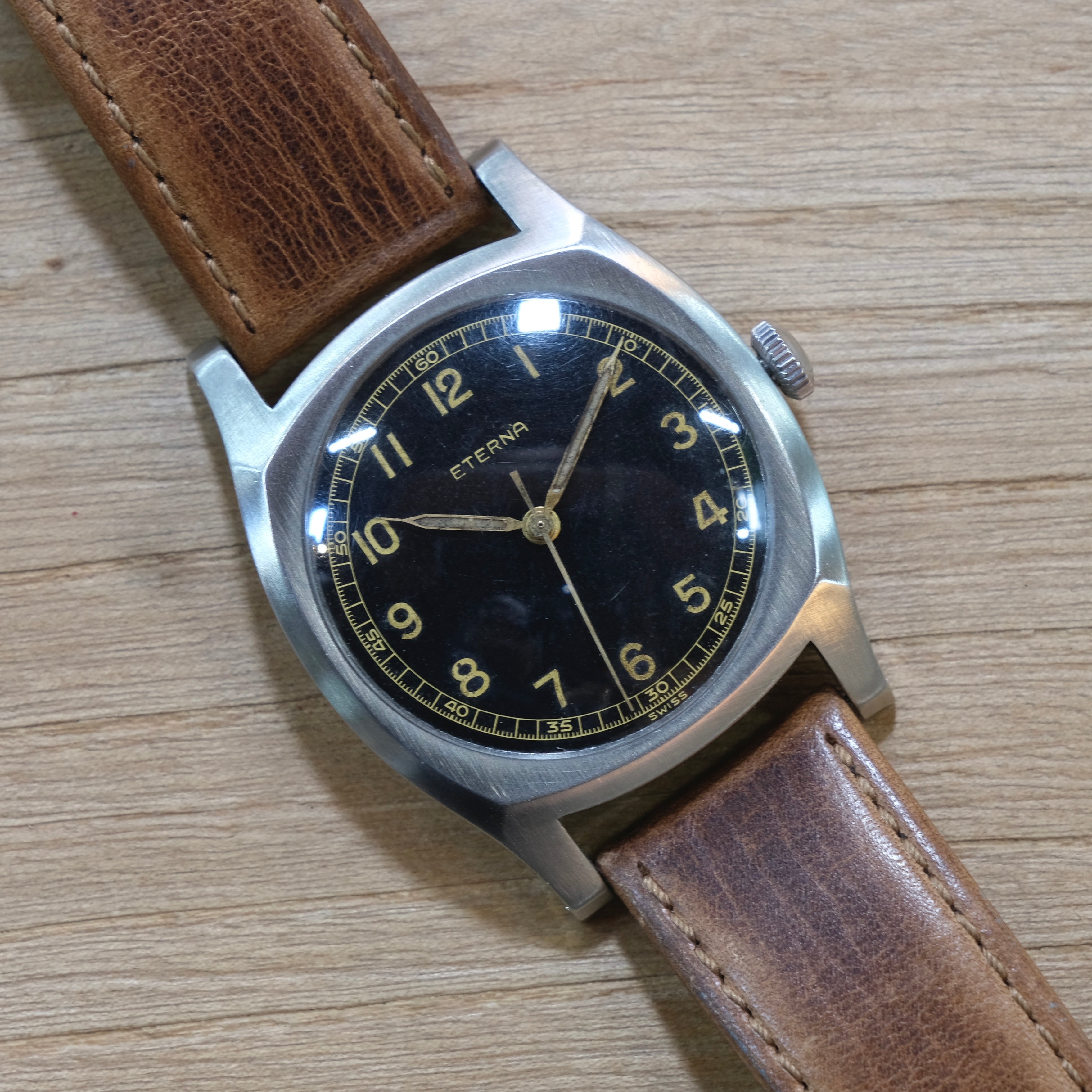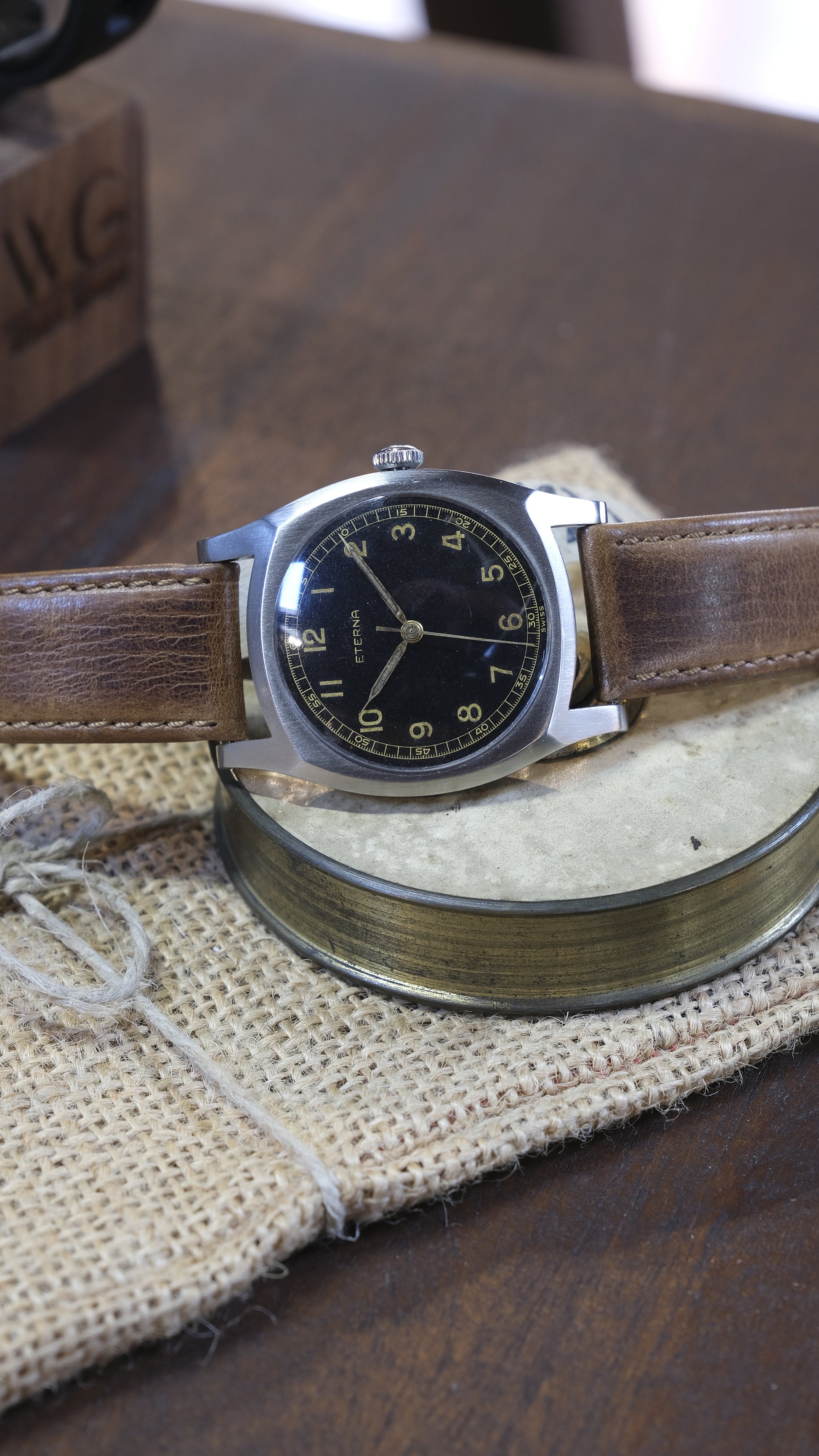 Durante as décadas de 1930 e 1940, a Eterna entregou este relógio de piloto à Força Aérea Tcheca. Produzido em conjunto com a Longines e Lemania e com duas variações de mostrador: os primeiros tinham um ponteiro de segundos na posição de 6 horas e uma gravação em uma das asas, enquanto os posteriores vieram com um ponteiro de segundos central e sem gravação, como o que apresentamos aqui.