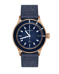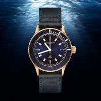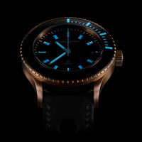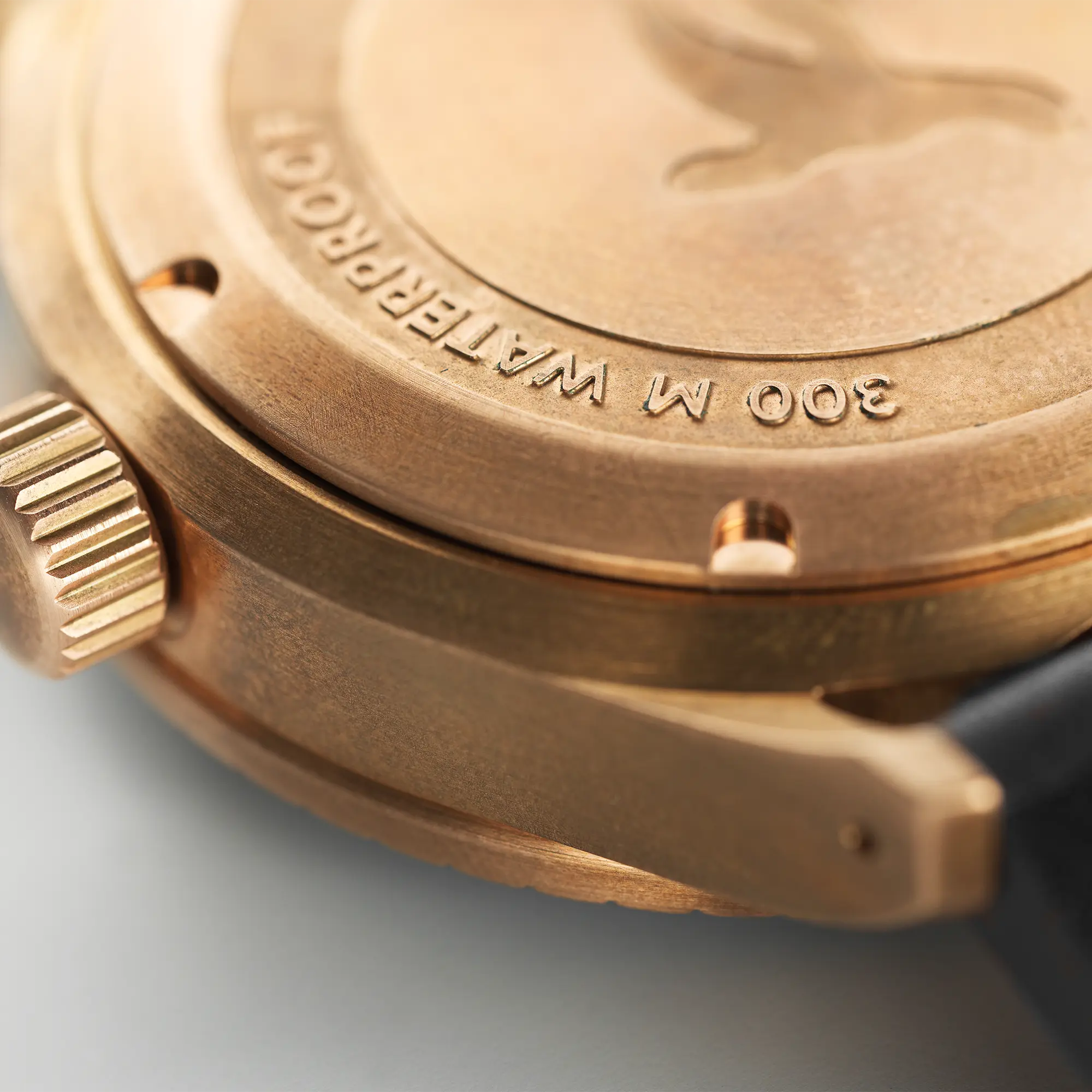 We use a very individual bronze alloy sourced in Zurich. Bronze is anti-magnetic, resistant to wear, elastic, slightly more brittle, and 10% heavier than stainless steel. Above all, it stands out due to its resistance to seawater. Beneath a layer of oxidized copper, the material offers lasting protection. The discoloration of the bronze is particularly appealing and means that every watch, over time, evolves into a unique piece—one solely influenced by the life of the watch owner. While bronze can stain, these stains are usually removed in the normal laundry process