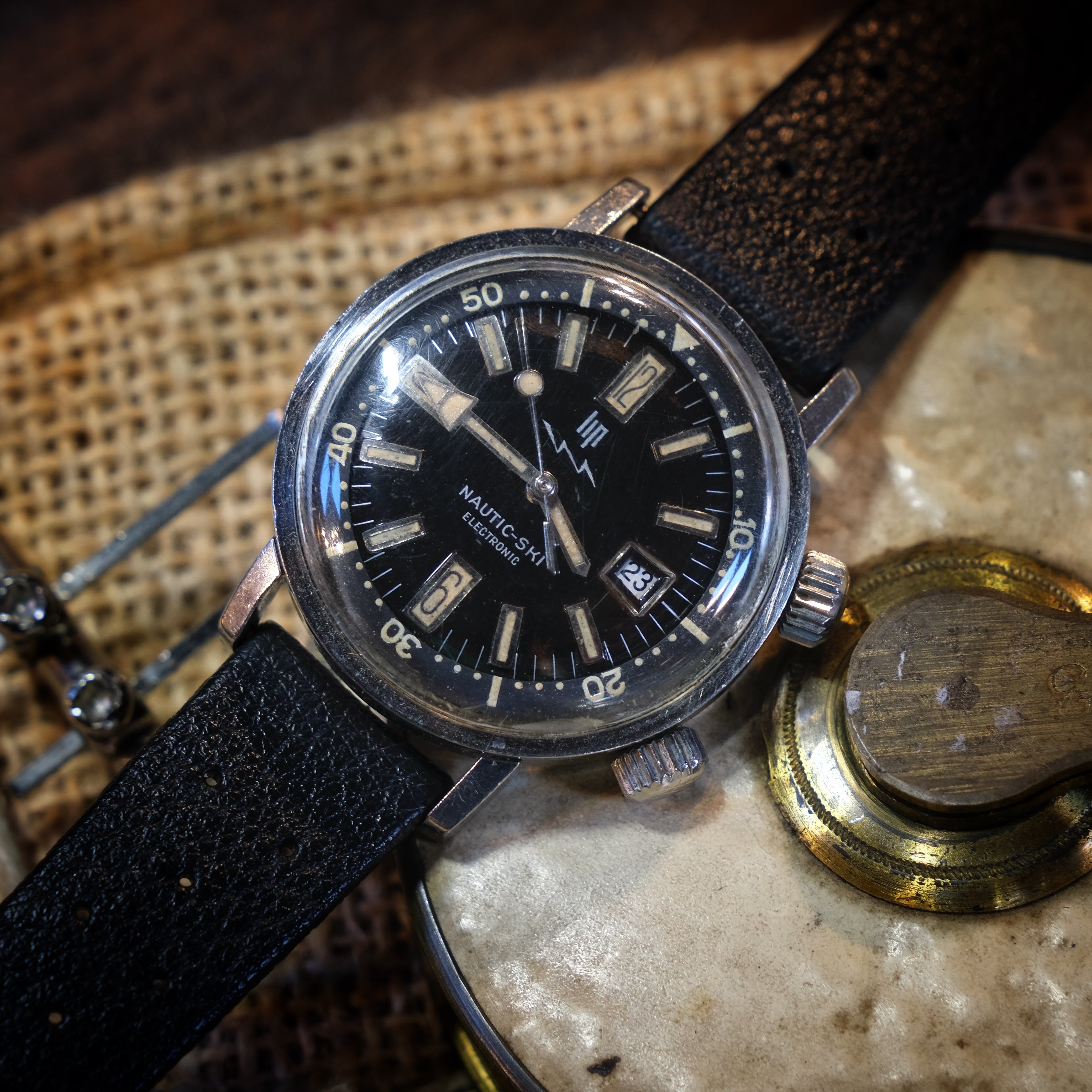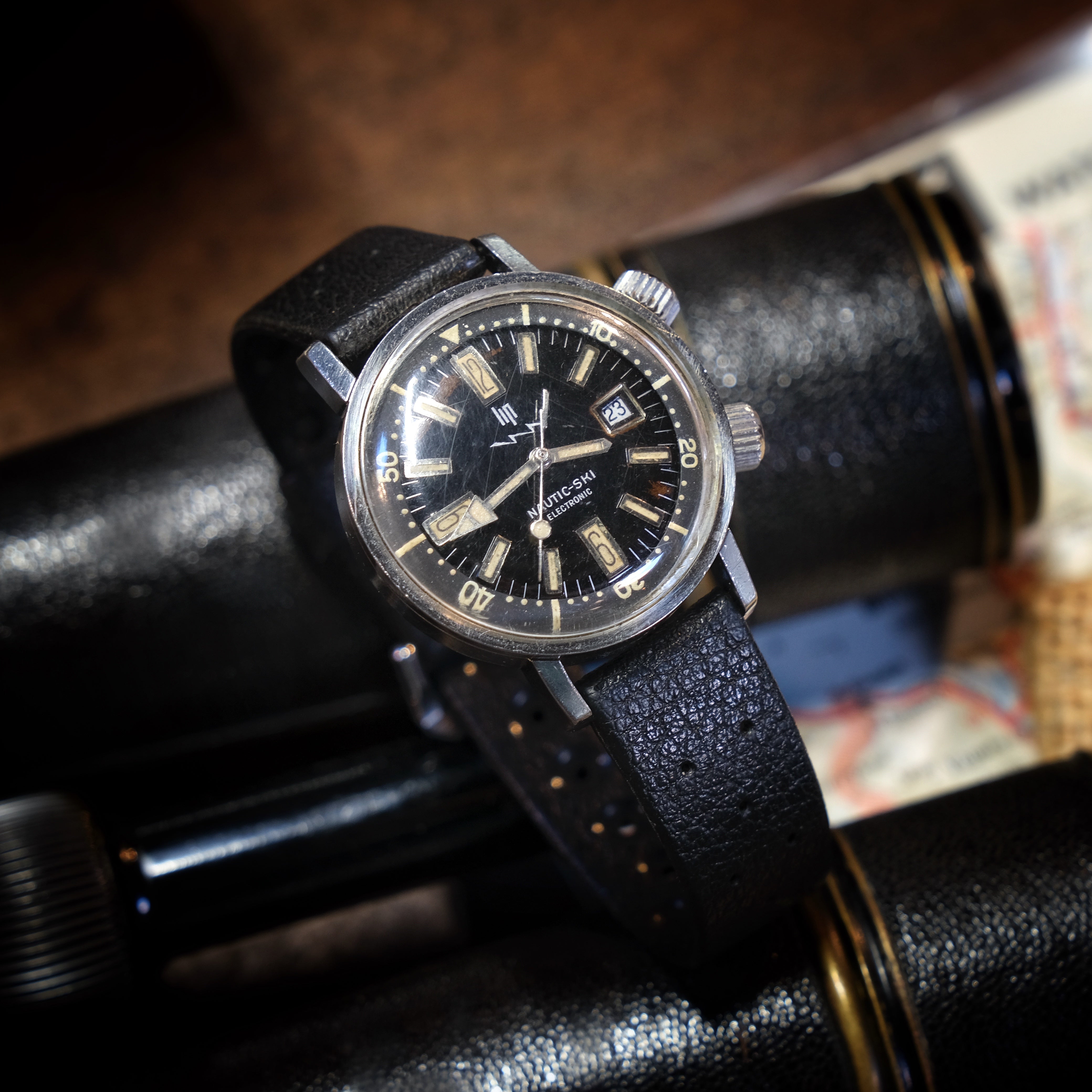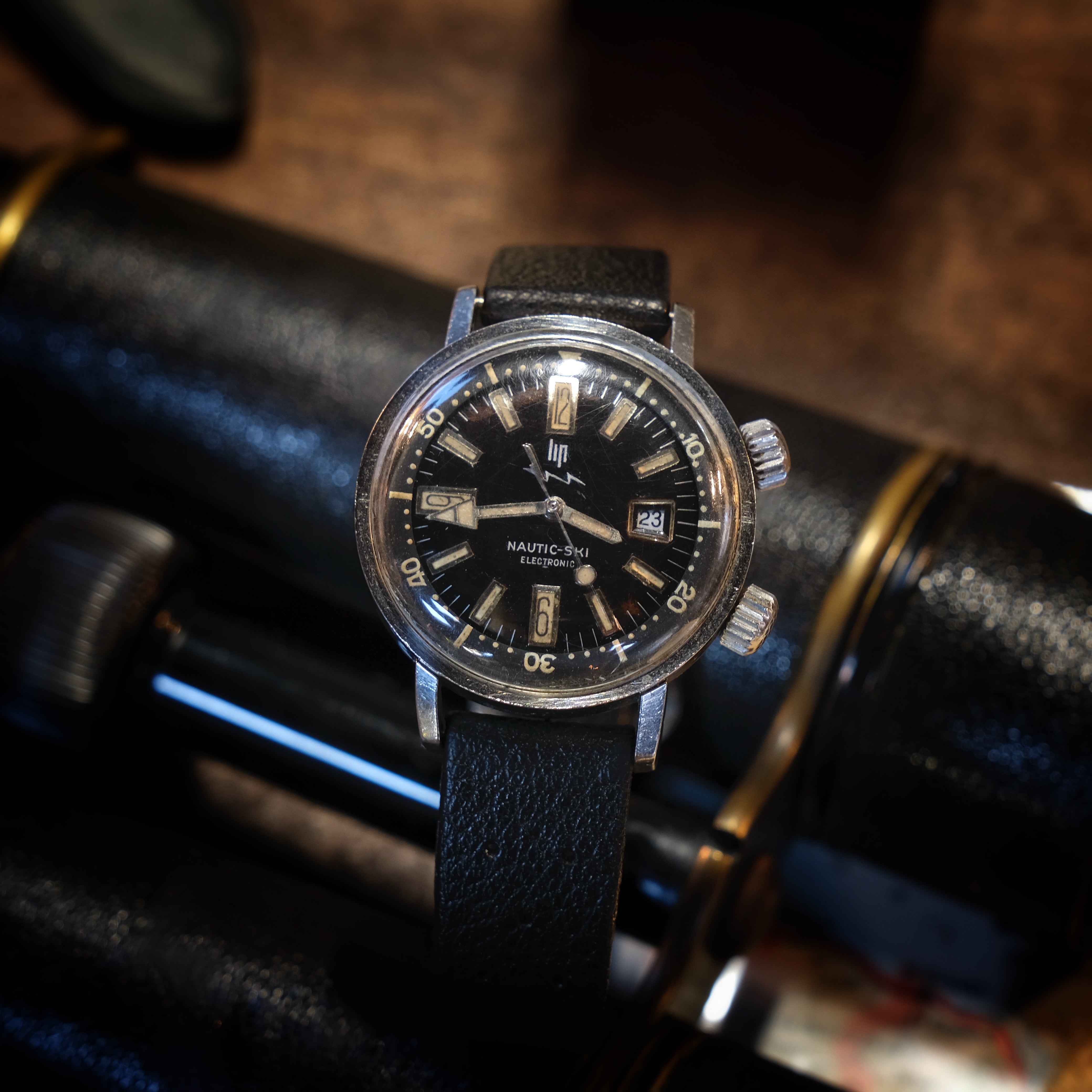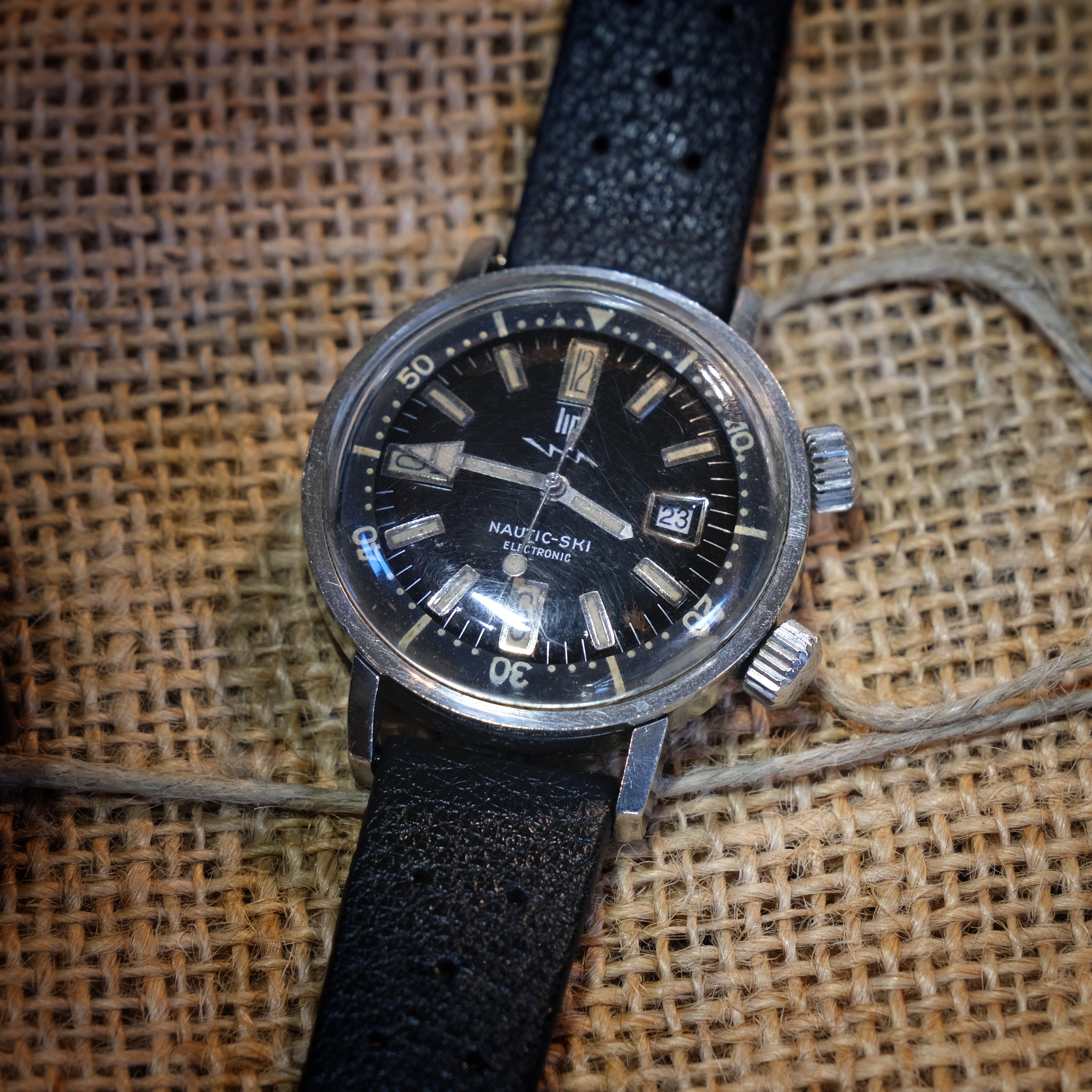 Este Nautic Ski é sem dúvida um dos relógios mais famosos desta marca francesa e percebe-se porquê. Caixa EPSA fabulosa, mostrador com indexes e ponteiros preenchidos com tritium que lhe dá uma patina espectacular e um mostrador preto brilhante que nunca passará de moda.