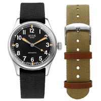 O OLD SMITH 90-002L vem com duas braceletes de nylon. Essas braceletes têm uma textura flexível e são usáveis para uma ampla gama de situações. Ao contrário das braceletes de couro tradicionais estas são perfeitas para os meses quentes de verão e para um look mais casual