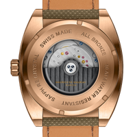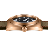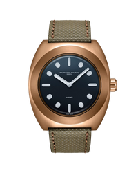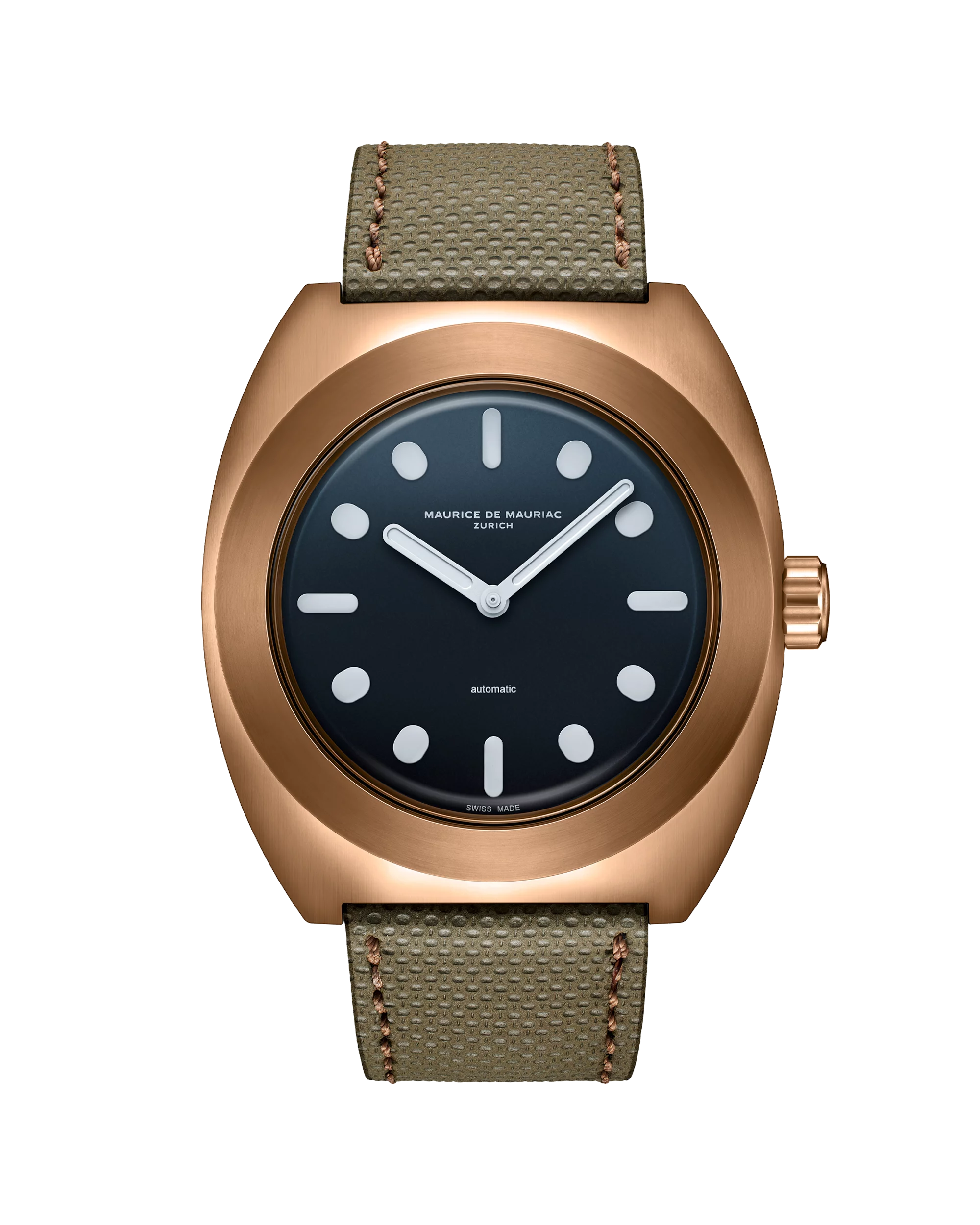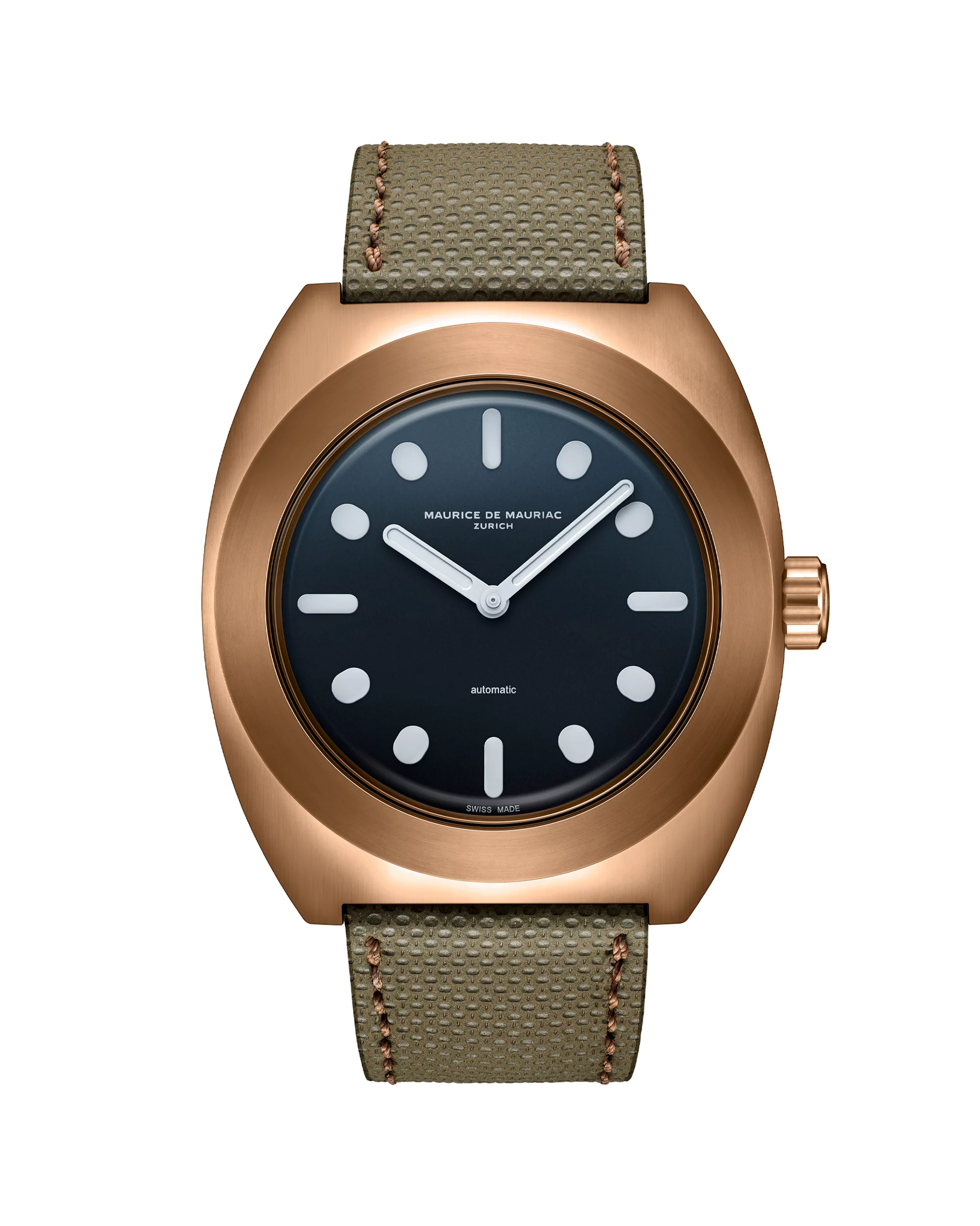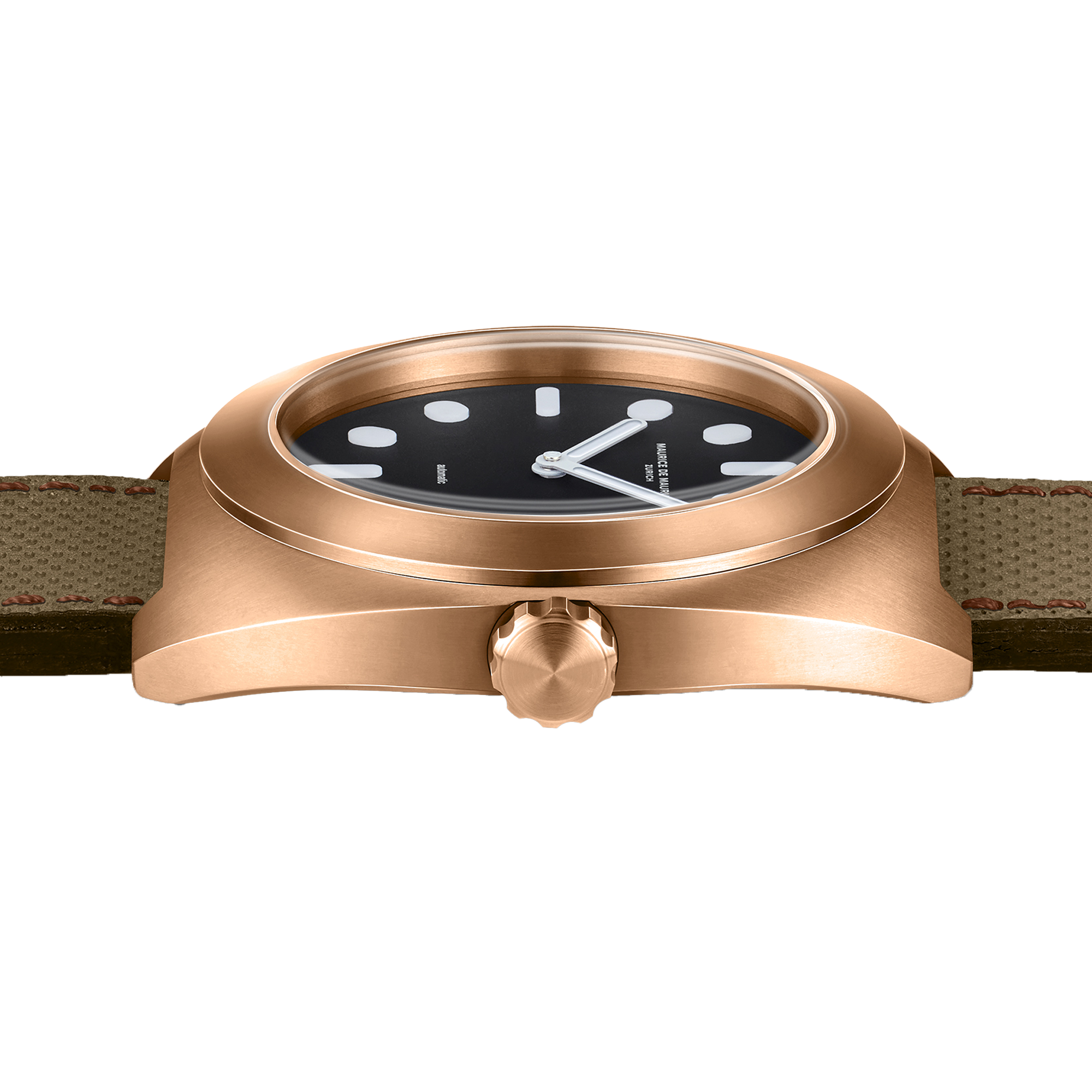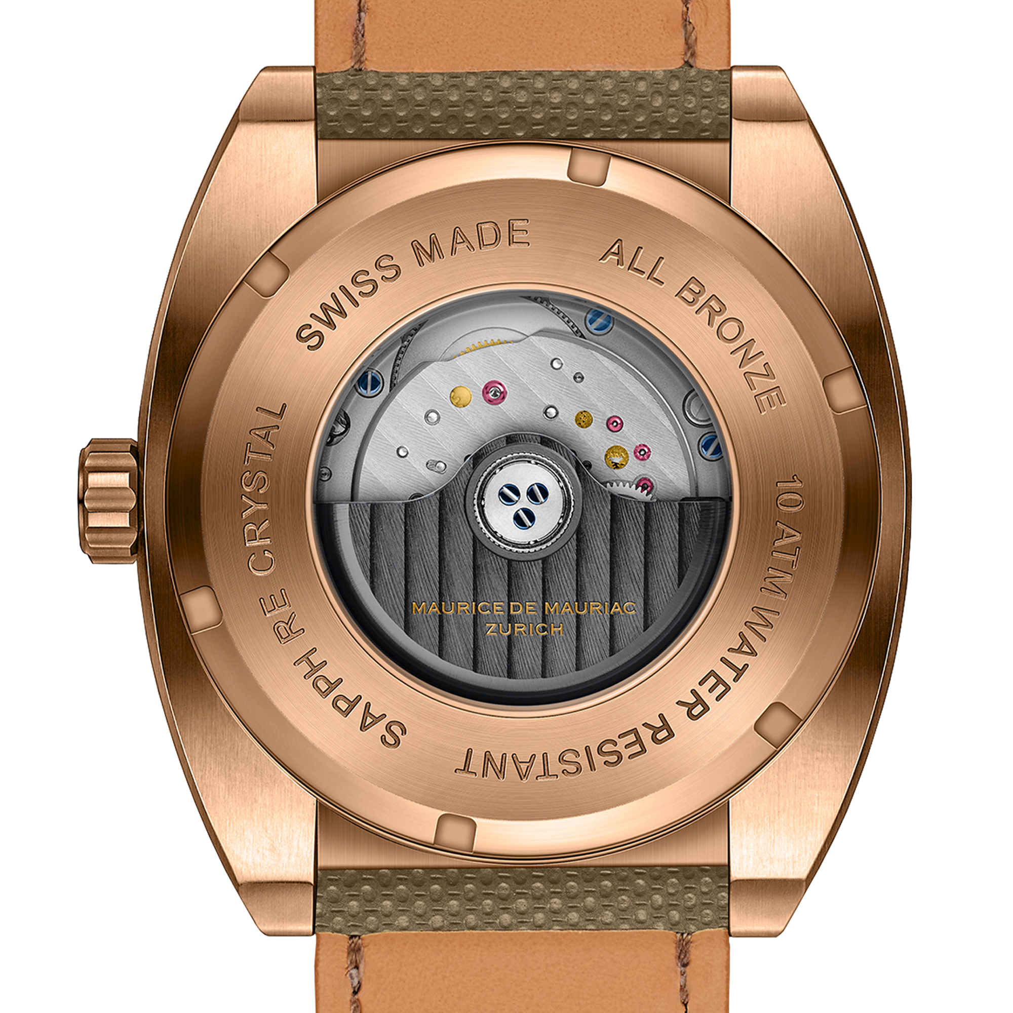 We use a very individual bronze alloy sourced in Zurich. Bronze is anti-magnetic, resistant to wear, elastic, slightly more brittle, and 10% heavier than stainless steel. Above all, it stands out due to its resistance to seawater. Beneath a layer of oxidized copper, the material offers lasting protection. The discoloration of the bronze is particularly appealing and means that every watch, over time, evolves into a unique piece—one solely influenced by the life of the watch owner. While bronze can stain, these stains are usually removed in the normal laundry process.