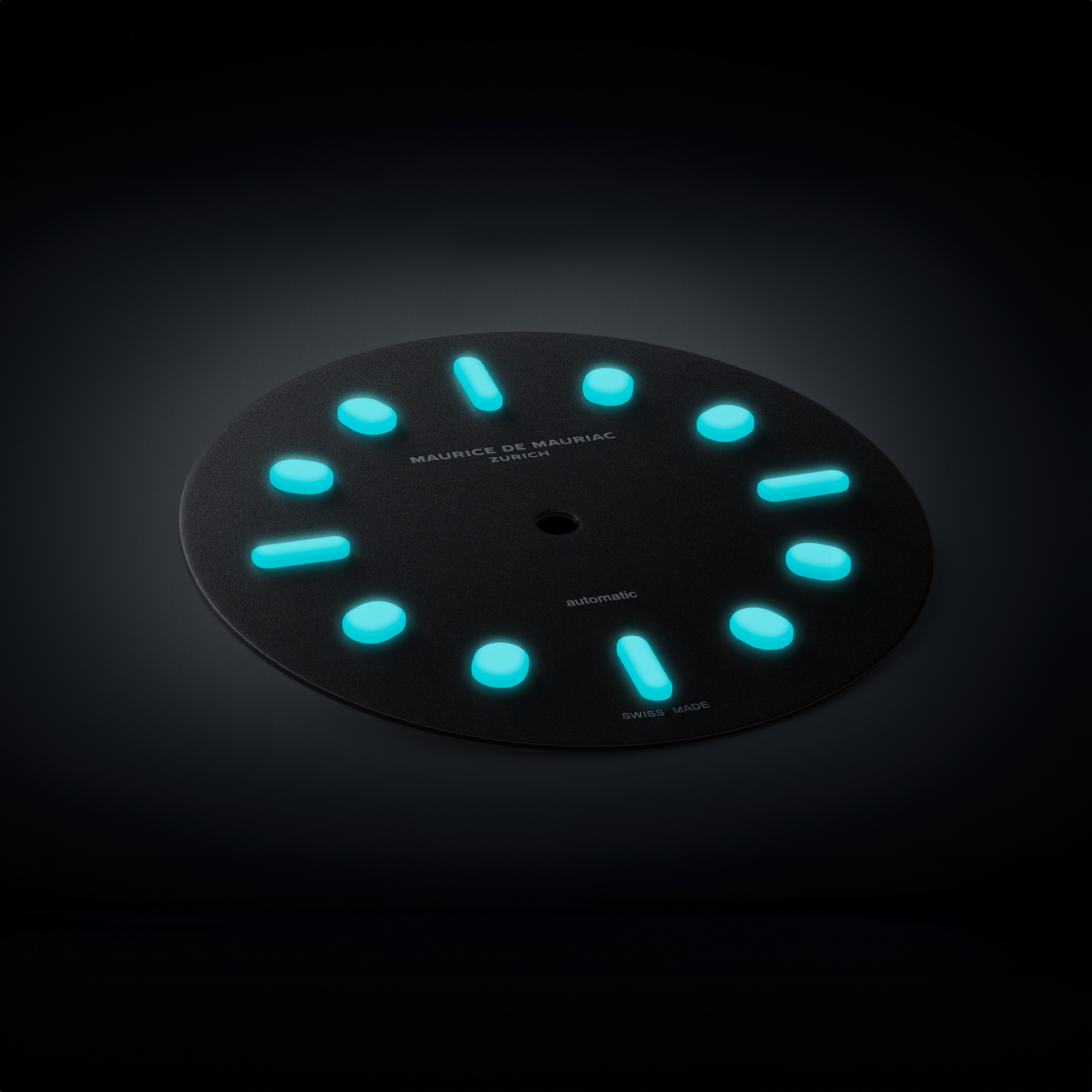 Superluminova is a phosphorescent phosphor, and free of radioactive additives. Superluminova is a hundred times brighter than other inactive luminescent pigments. When the luminescent pigments have been excited by daylight or artificial light, they release the absorbed light energy over several hours in the dark. This gives the watch extremely good clarity even in the dark.