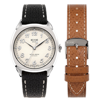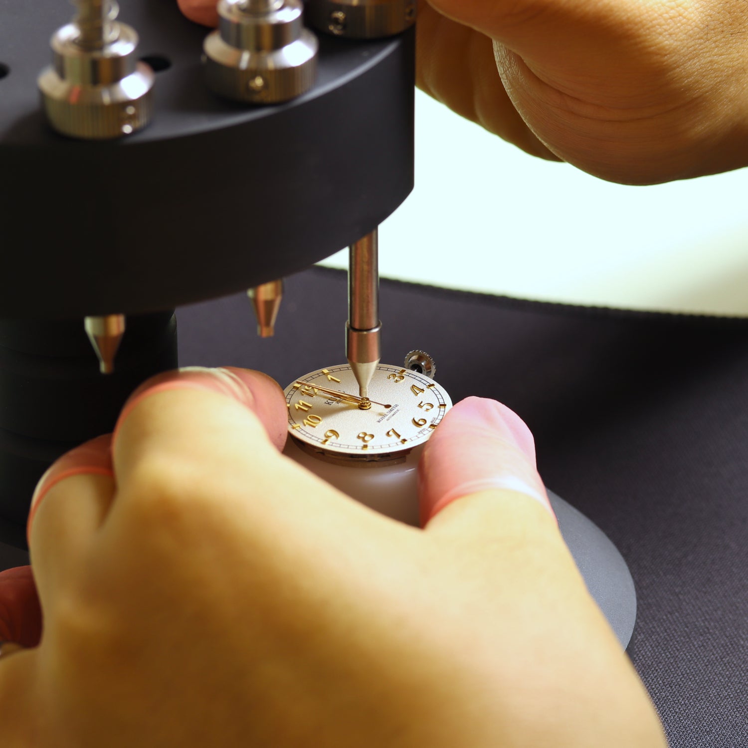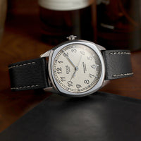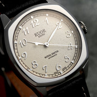 Projetado do zero com peças cuidadosamente selecionadas. Inspirado em relógios antigos da década de 1940, este modelo usa uma caixa tipo almofada que era comum naqueles dias. Os clássicos numerais Breguet no mostrador são aplicados individualmente à mão e damos texturas à superfície do mostrador. O vidro e a parte traseira do relógio são equipados com cristais de safira abobadados com revestimento AR. Cada relógio é montado individualmente pelos próprios relojoeiros da KUOE na oficina em KYOTO.