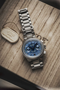 É o nosso primeiro modelo a apresentar um cronógrafo automático, equipado com um calibre de fabricação japonesa, NE86A, um movimento premium desenvolvido pela TMI (Seiko Time Module). O NE86A é um cronógrafo automático bi-compax com um totalizador de 30 minutos. Este movimento high beat oscila a 28.800 vezes por hora (8 vezes por segundo), aumentando a suavidade do balanço do ponteiro dos segundos e aumentando a precisão do relógio.