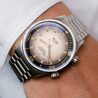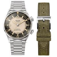 Este relógio é resistente à água até 20 BAR, resistente a choques, tem cristal de safira resistente a arranhões e ainda vem com uma caixa resistente a campos magnéticos, tornando-o o "tool watch" mais definitivo da KUOE até o momento.