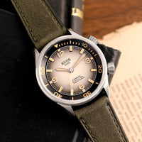 O mostrador do relógio tem um acabamento de linho que lhe dá uma textura única. Os ponteiros e os índices são de aço inoxidável escovado que usam o Super-Luminova Swiss colorido Old Radium para iluminação brilhante e duradoura. As marcações da escala também têm lume aplicado.