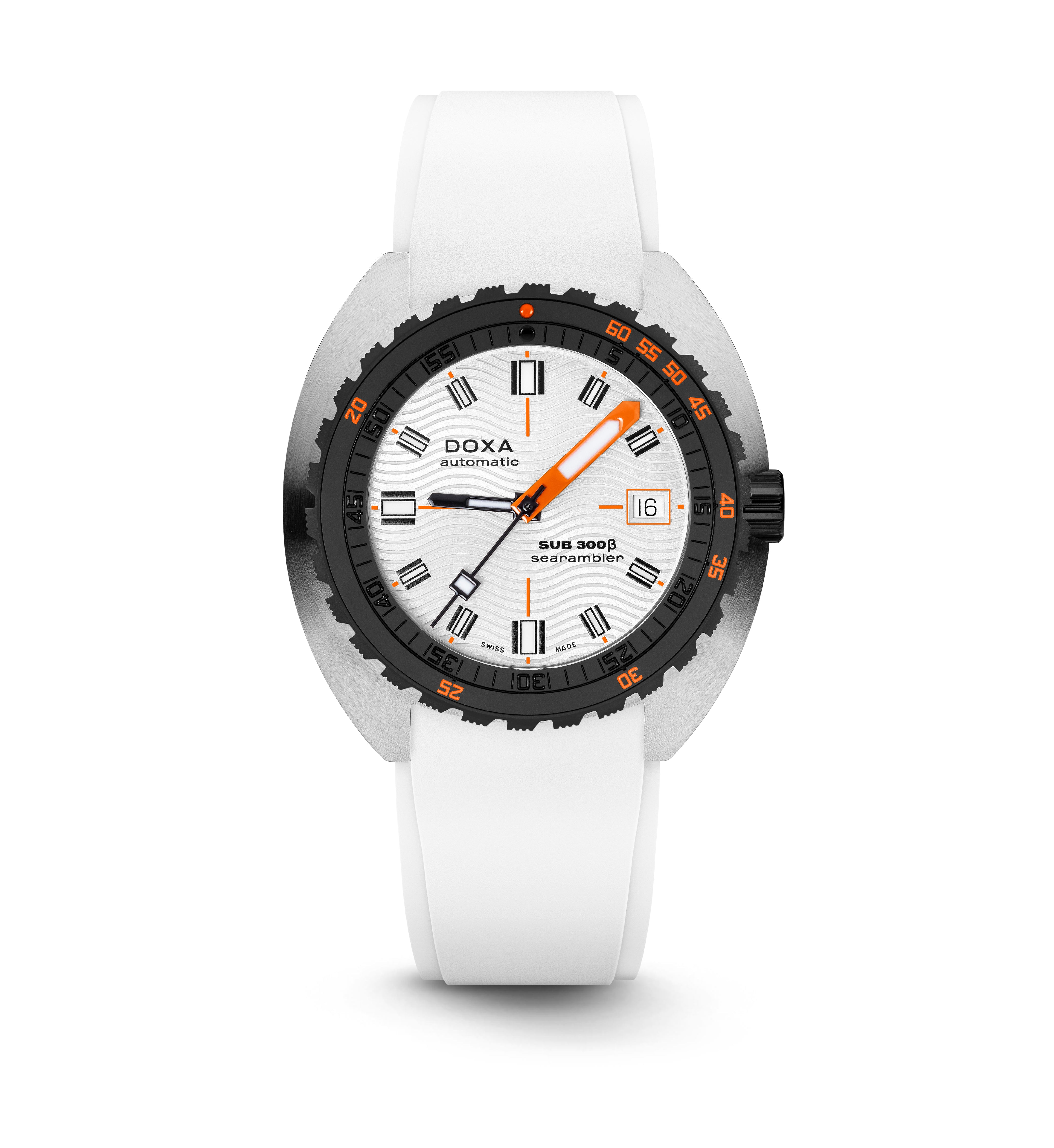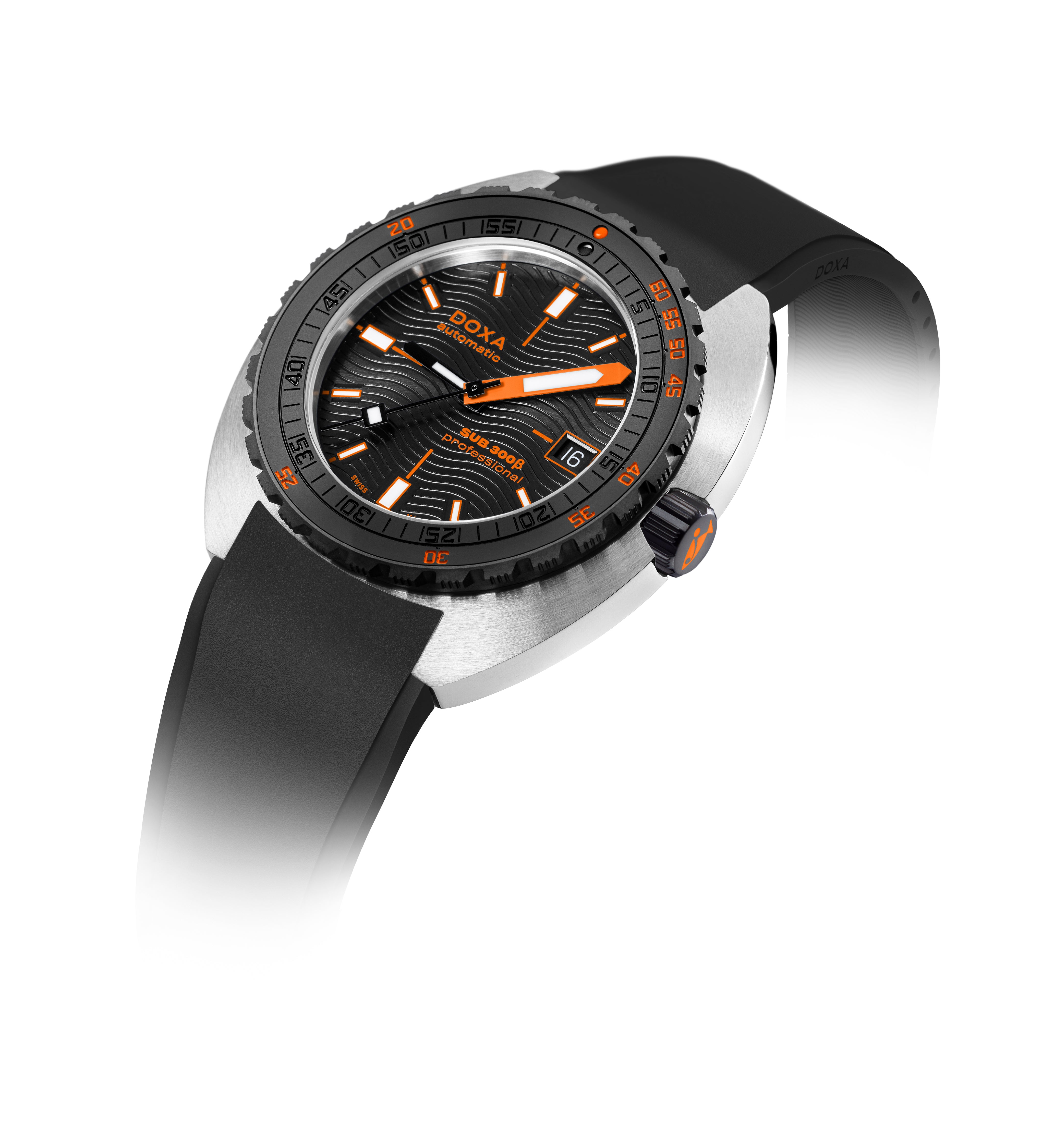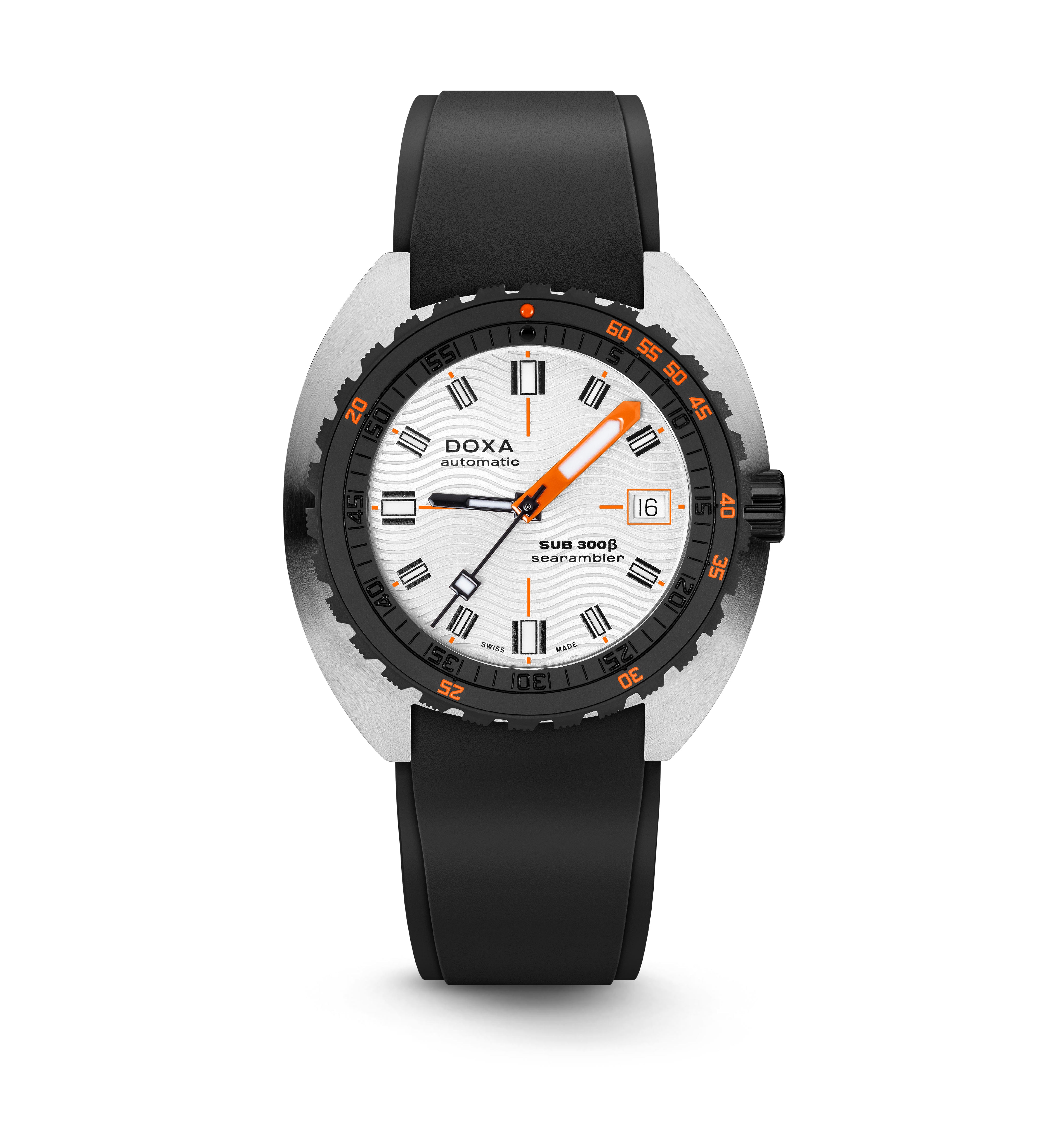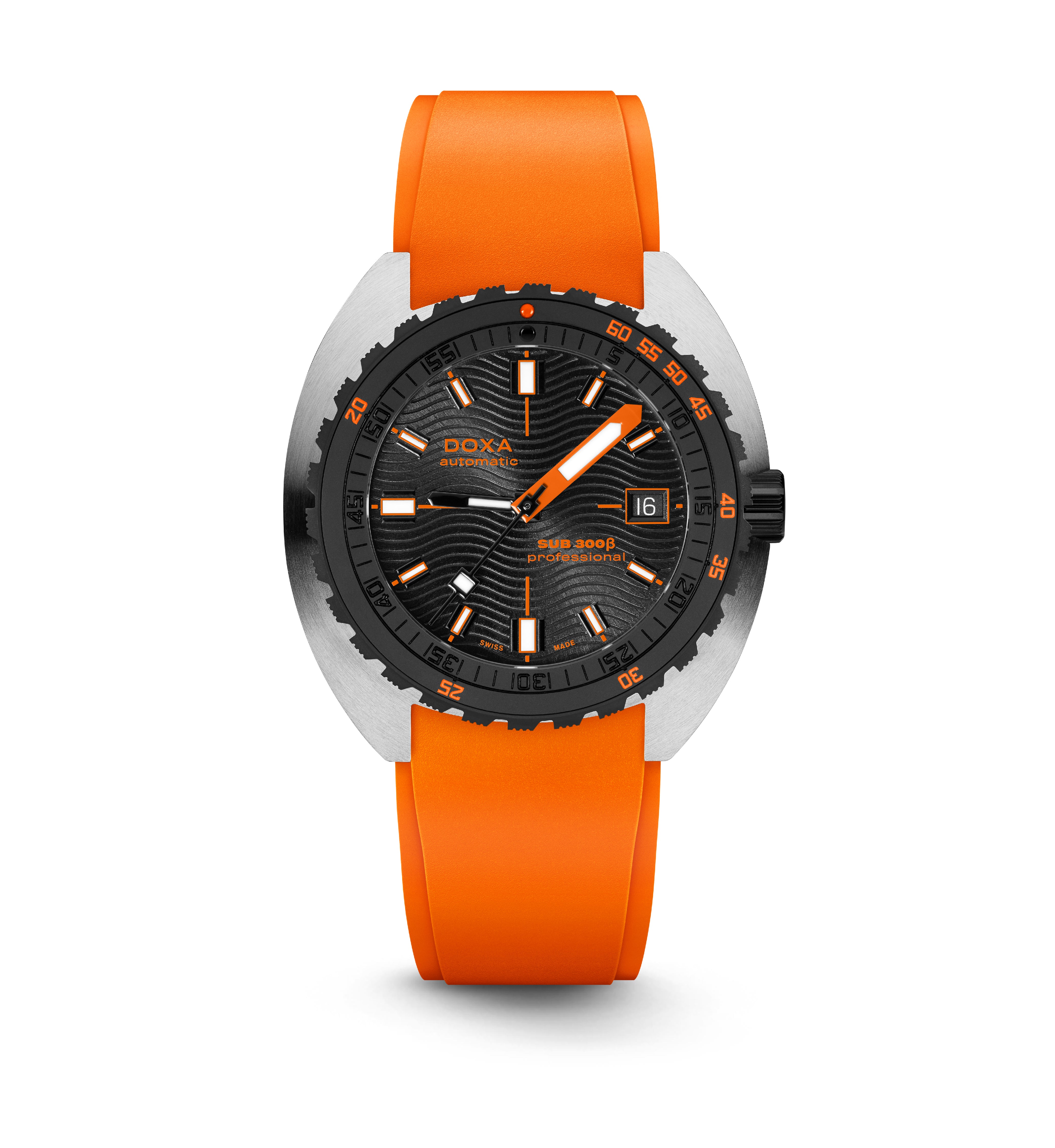 O relógio desportivo SUB 300β combina funcionalidade com estilo, mantendo os recursos fundamentais do relógio de ferramentas em uma caixa redesenhada de 42,5mm de diâmetro, agora mais fina em 11,95 mm. A luneta de cerâmica preta e a coroa de rosca aumentam seu caráter desportivo-chique, complementado por um sofisticado acabamento de mostrador sunburst. Disponível com uma bracelete de borracha FKM ou pulseira de aço inoxidável "Beads of Rice", ambas com um fecho dobrável, o relógio é resistente à água até 300 metros. Com um vidro de safira resistente a arranhões, movimento automático suíço e uma reserva de energia de cerca de 38 horas, o SUB 300β é projectado para segurança e exploração. Fiel ao ethos não convencional da DOXA, ele combina o espírito dos tempos com um visual elegante e moderno e desportivo chique, adequado para ambientes urbanos.
