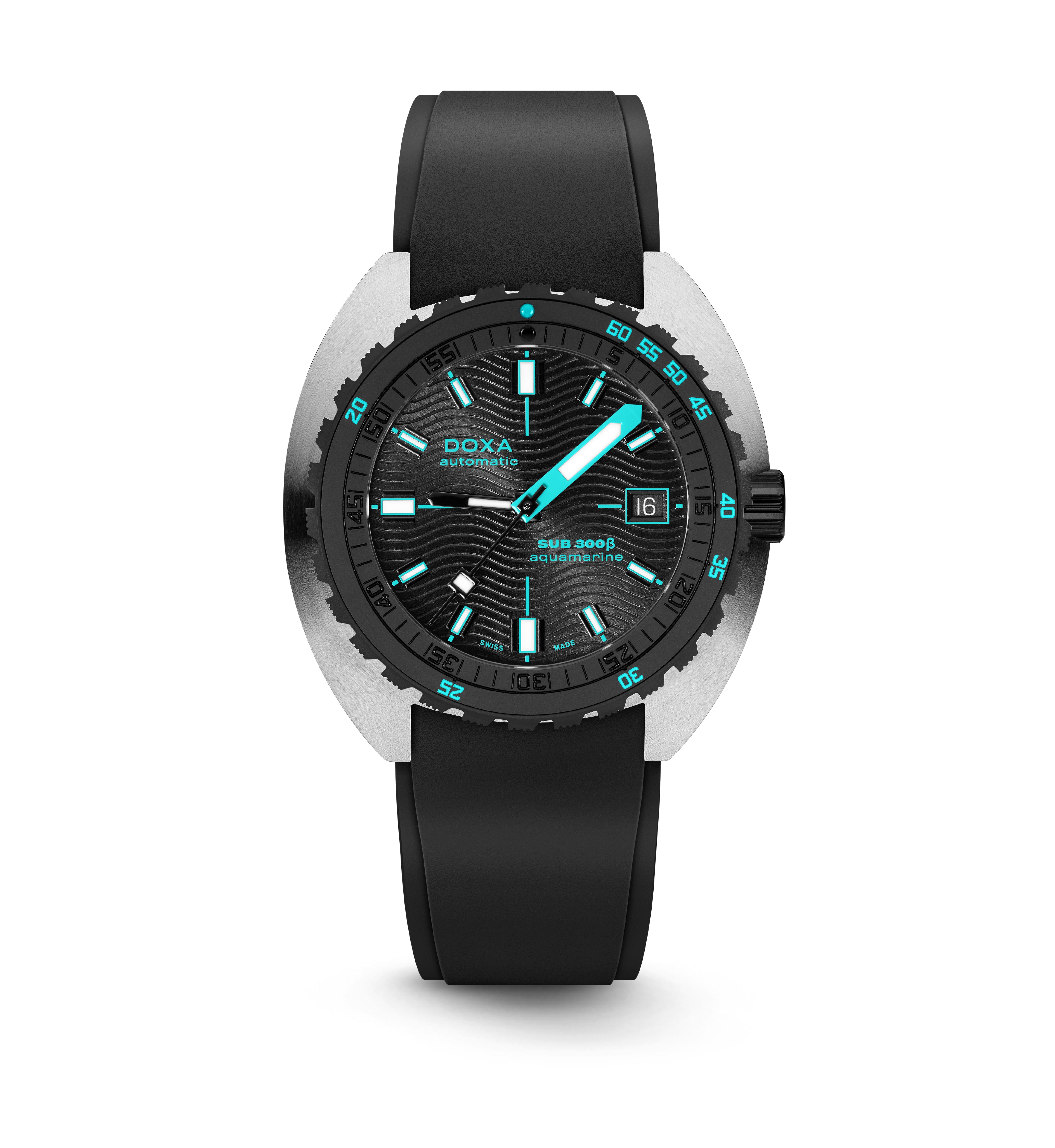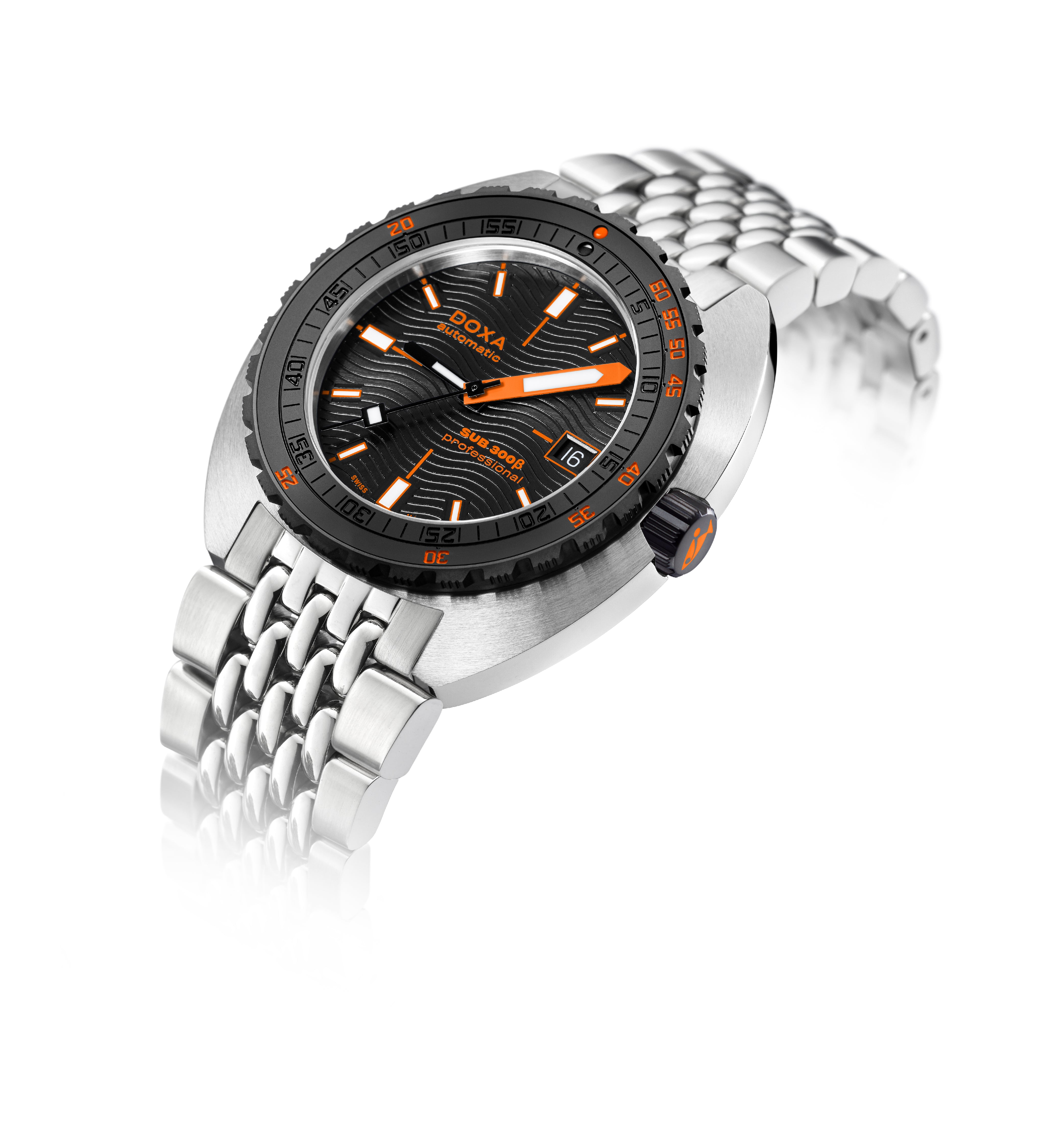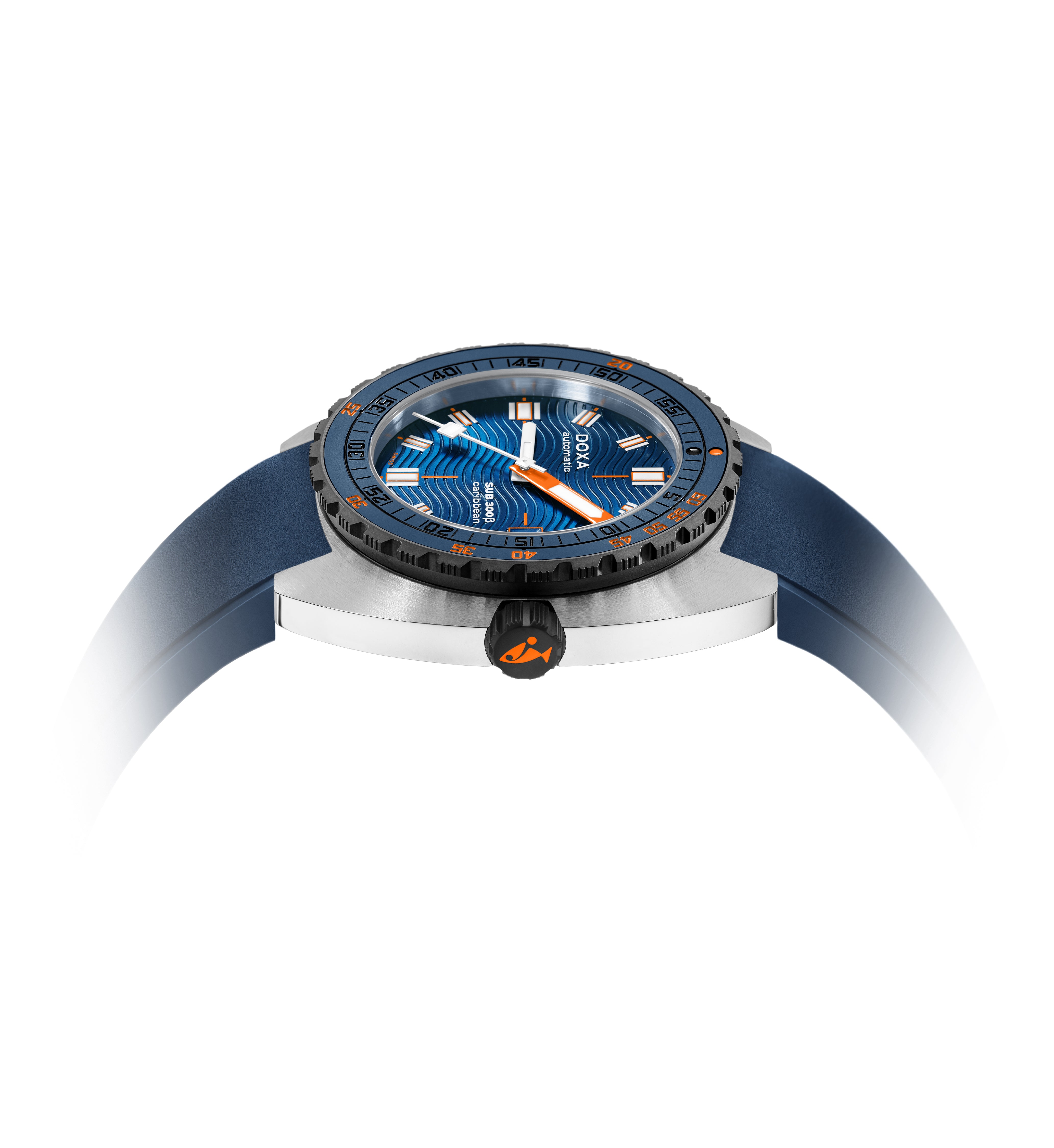 O relógio desportivo SUB 300β combina funcionalidade com estilo, mantendo os recursos fundamentais do relógio de ferramentas em uma caixa redesenhada de 42,5mm de diâmetro, agora mais fina em 11,95 mm. A luneta de cerâmica preta e a coroa de rosca aumentam seu caráter desportivo-chique, complementado por um sofisticado acabamento de mostrador sunburst. Disponível com uma bracelete de borracha FKM ou pulseira de aço inoxidável "Beads of Rice", ambas com um fecho dobrável, o relógio é resistente à água até 300 metros. Com um vidro de safira resistente a arranhões, movimento automático suíço e uma reserva de energia de cerca de 38 horas, o SUB 300β é projectado para segurança e exploração. Fiel ao ethos não convencional da DOXA, ele combina o espírito dos tempos com um visual elegante e moderno e desportivo chique, adequado para ambientes urbanos.