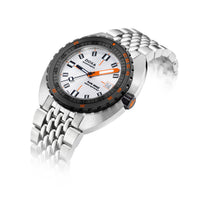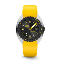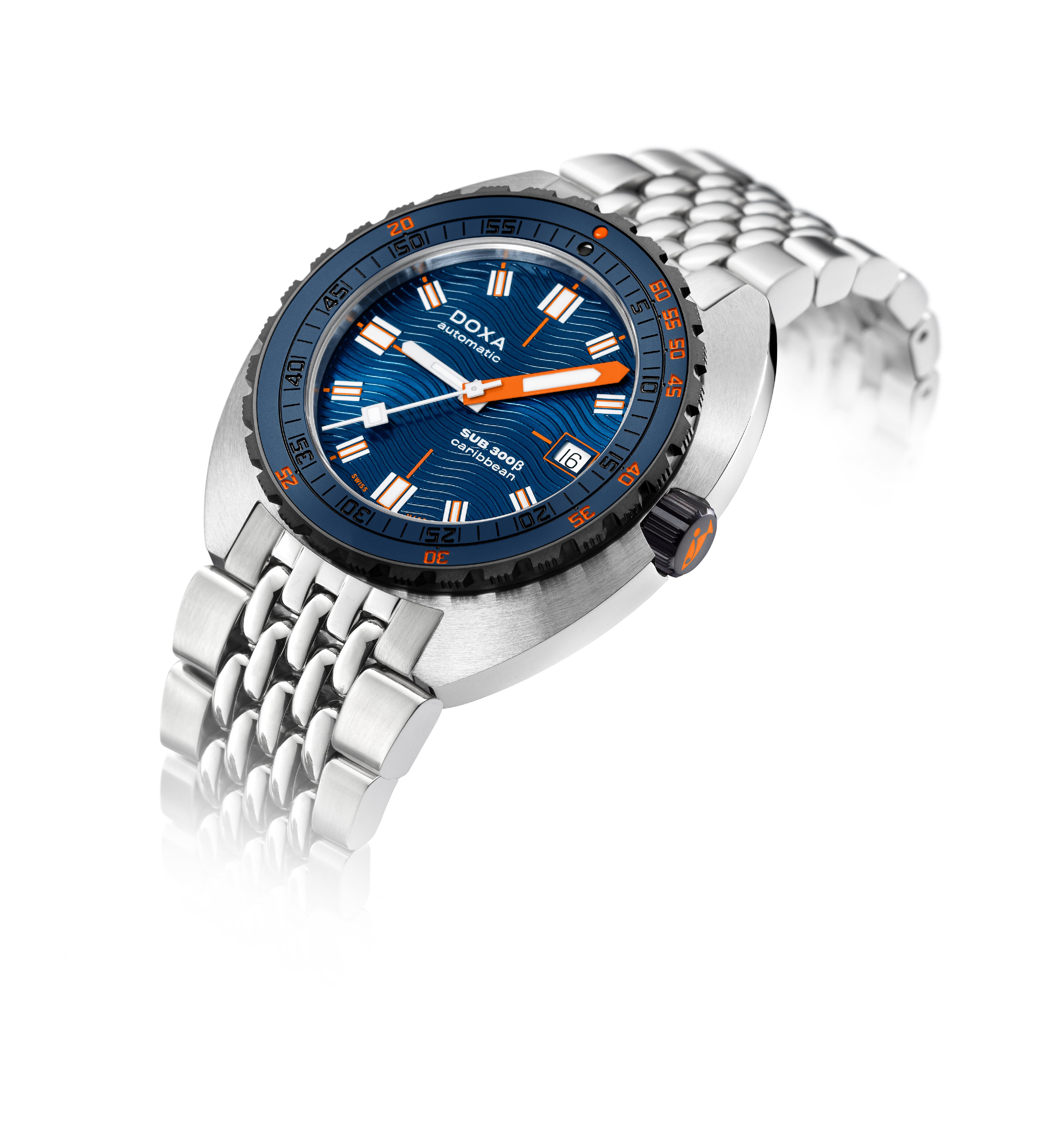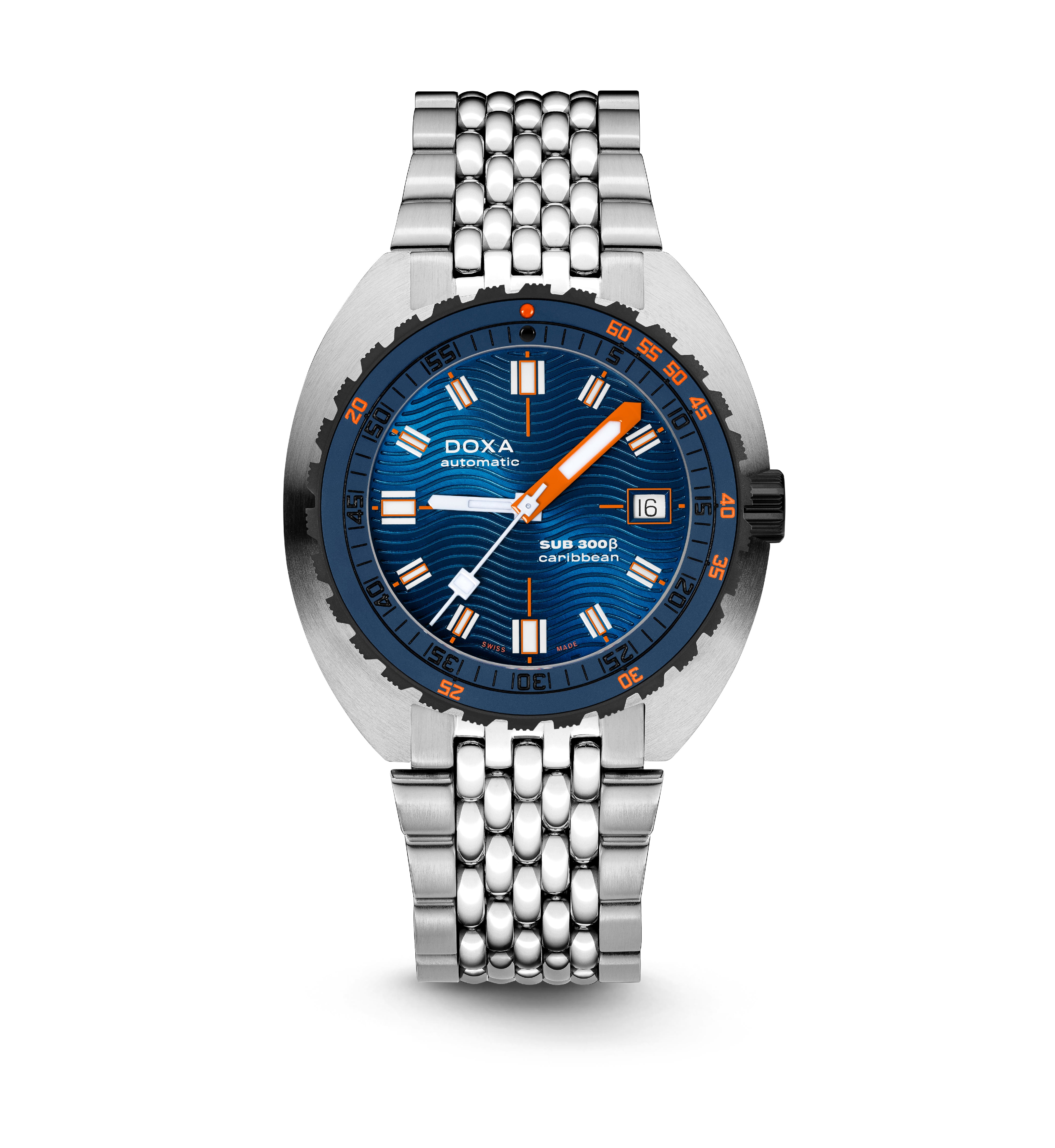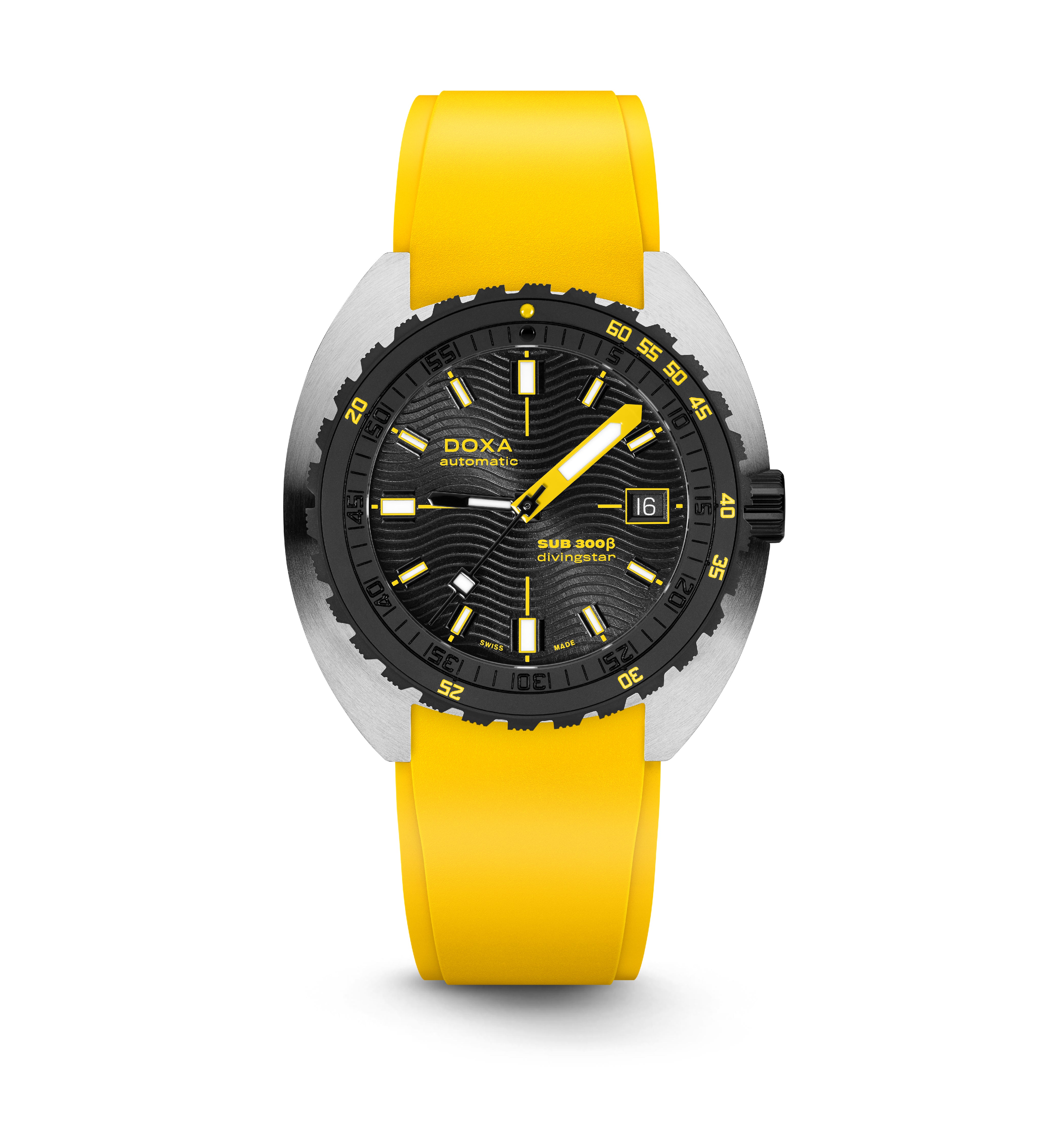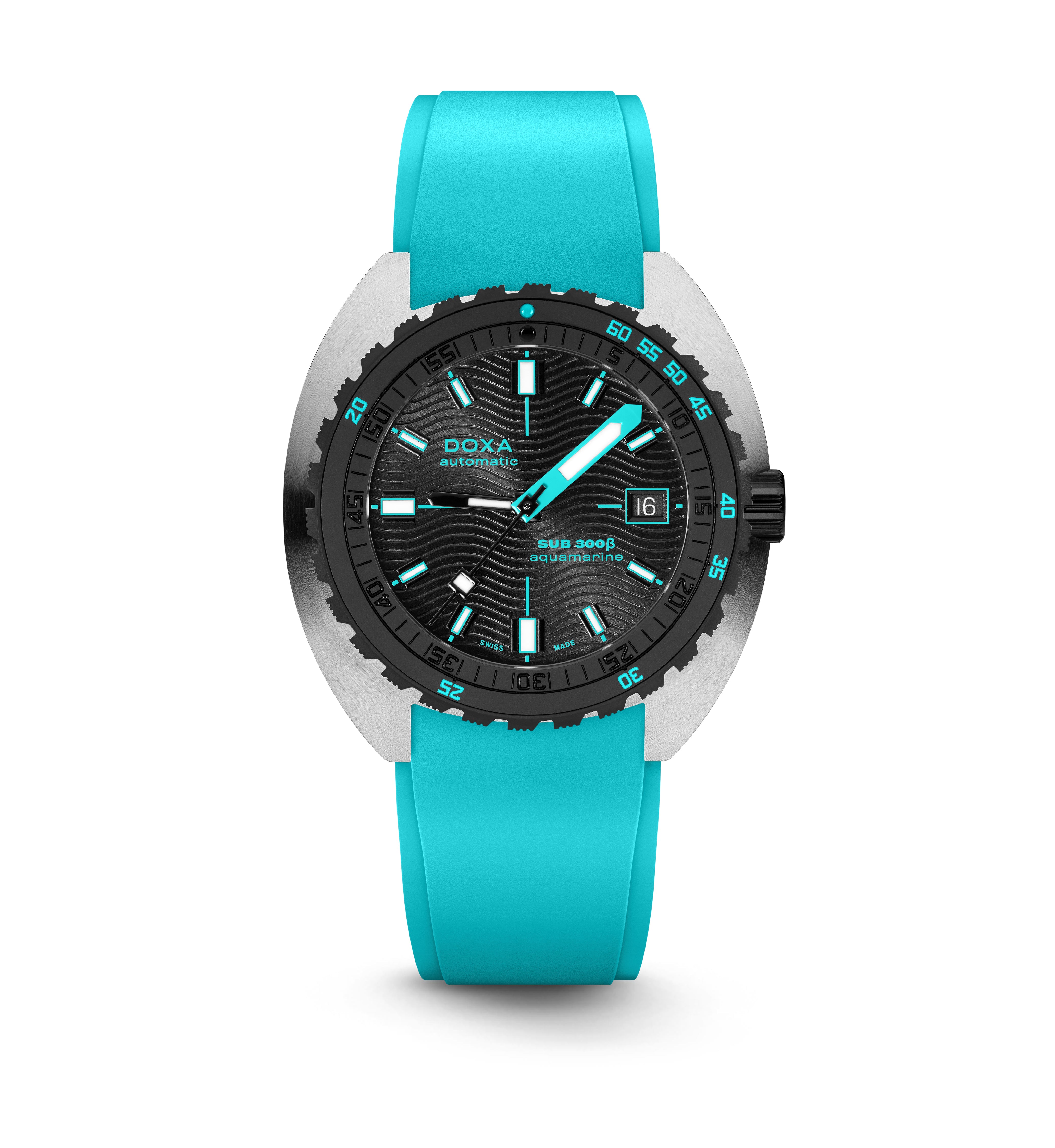 O relógio desportivo SUB 300β combina funcionalidade com estilo, mantendo os recursos fundamentais do relógio de ferramentas em uma caixa redesenhada de 42,5mm de diâmetro, agora mais fina em 11,95 mm. A luneta de cerâmica preta e a coroa de rosca aumentam seu caráter desportivo-chique, complementado por um sofisticado acabamento de mostrador sunburst. Disponível com uma bracelete de borracha FKM ou pulseira de aço inoxidável "Beads of Rice", ambas com um fecho dobrável, o relógio é resistente à água até 300 metros. Com um vidro de safira resistente a arranhões, movimento automático suíço e uma reserva de energia de cerca de 38 horas, o SUB 300β é projectado para segurança e exploração. Fiel ao ethos não convencional da DOXA, ele combina o espírito dos tempos com um visual elegante e moderno e desportivo chique, adequado para ambientes urbanos.