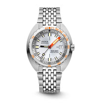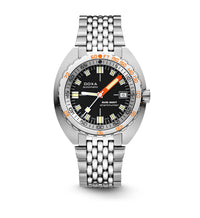 Este relógio de mergulhador, disponível em 8 cores de mostrador, combina os genes estéticos do SUB 300T Conquistador com os refinamentos técnicos que definem o relógio de mergulhador de alto desempenho de hoje. Construído a partir de aço inoxidável 316L da mais alta qualidade, o SUB 300T tem um diâmetro de 42,5 mm e um vidro de safira resistente a arranhões com um revestimento antirreflexo. Classificado para suportar pressões de até 120 bar, este relógio é efetivamente à prova d'água até uma profundidade de 1.200 metros e possui a luneta rotativa unidirecional patenteada com uma calculadora de tempo de mergulho integrada sem descompressão. Todos os elementos que fornecem informações relevantes para o mergulho são destacados com uma inserção luminescente Super-LumiNova® para garantir a legibilidade ideal debaixo d'água. A pulseira é de aço inoxidável 316L e possui um fecho dobrável com o símbolo de peixe DOXA.