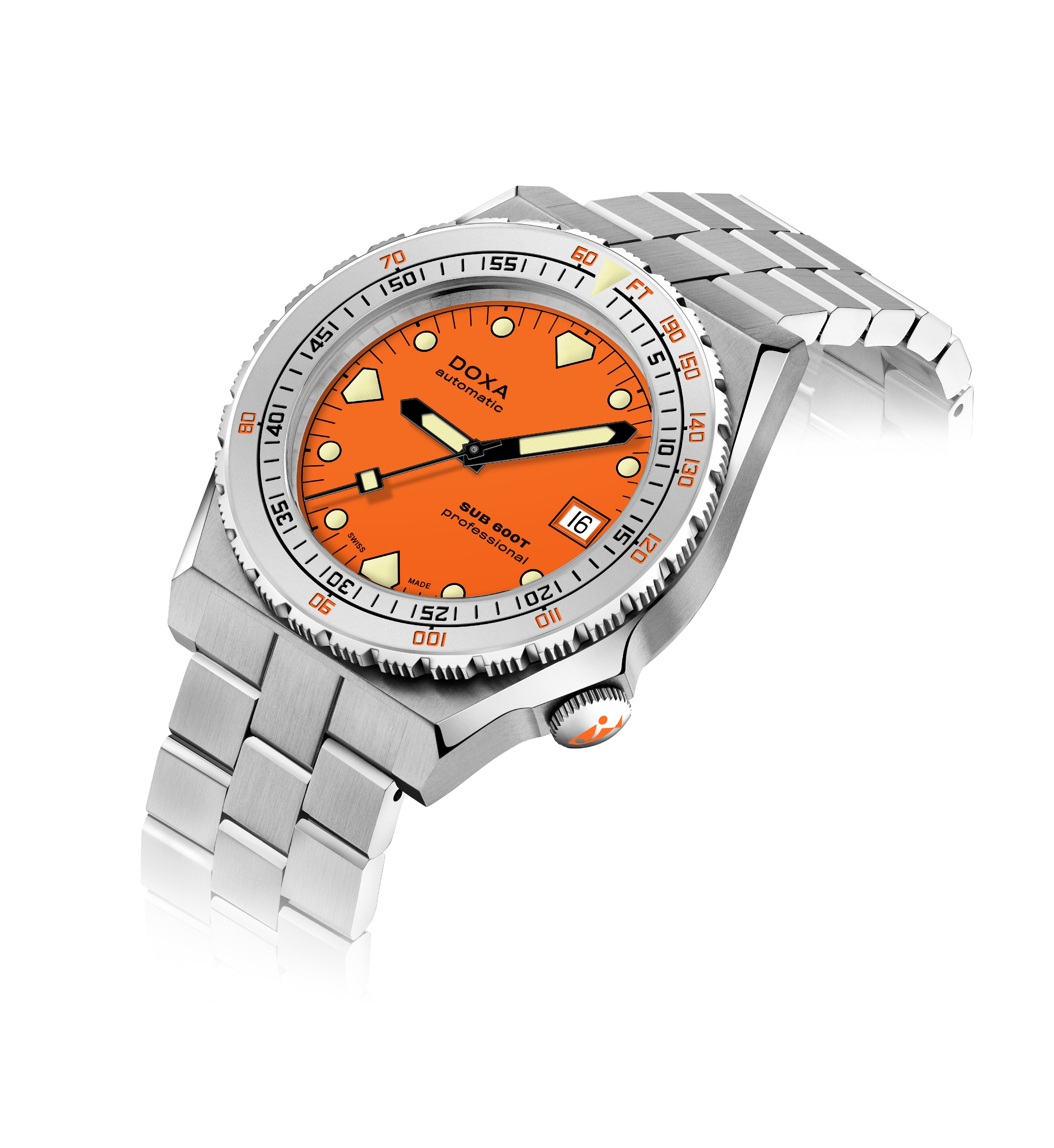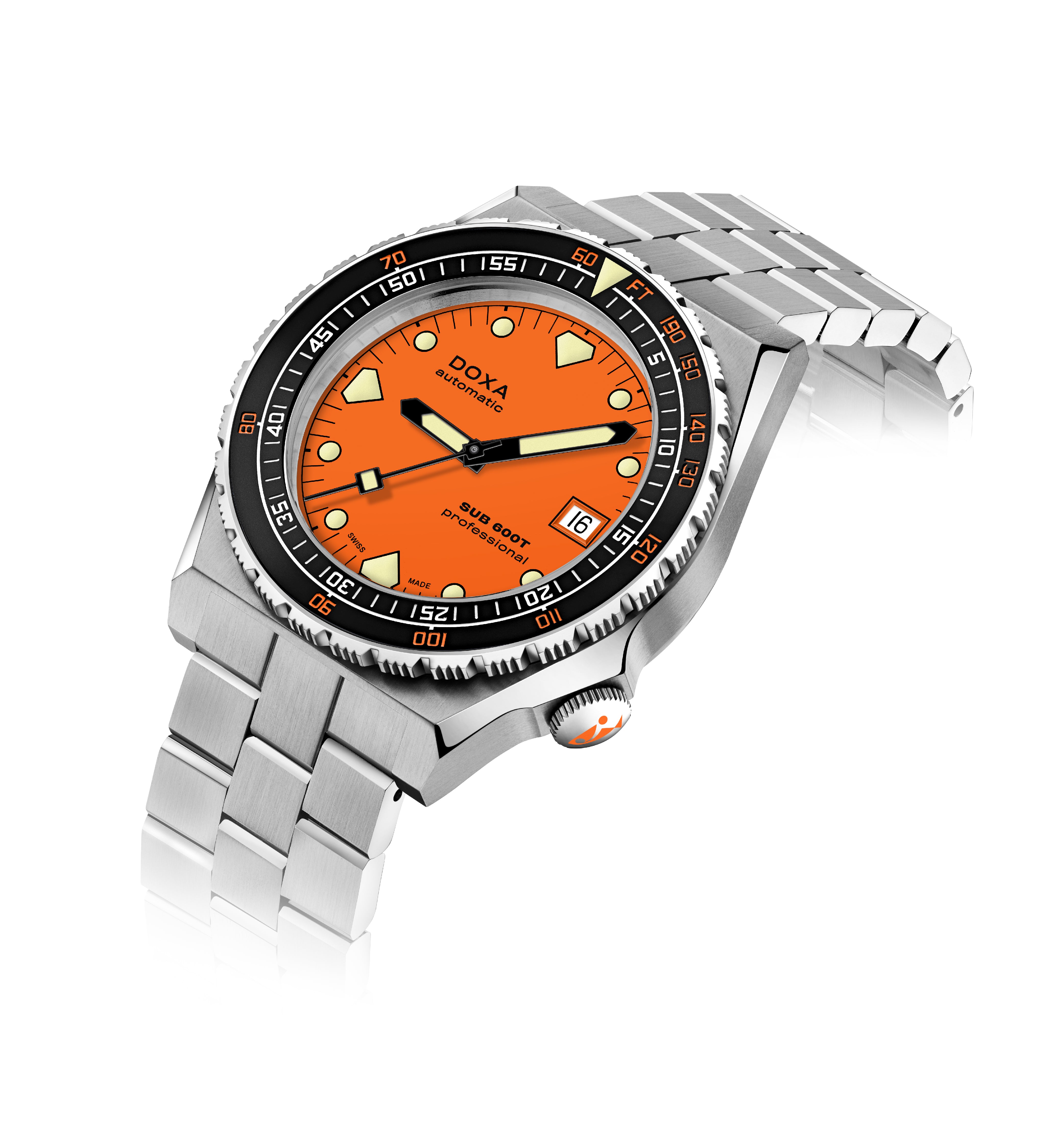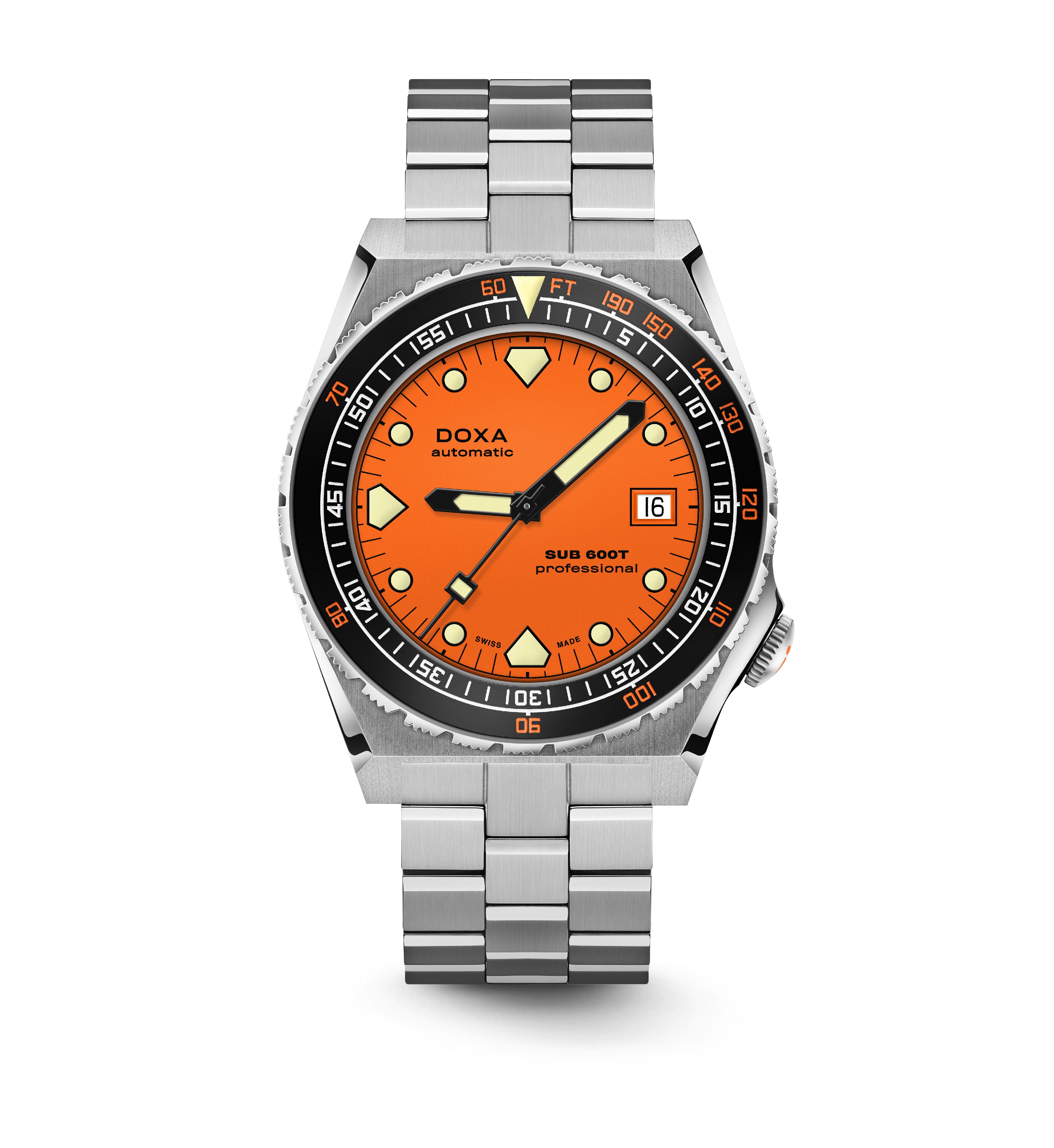 O SUB 600T com 3 mãos e data permanece fiel como sempre à estética do SUB 600T que definiu a DOXA nos anos 80 e se tornou um ícone de sua época. Ao mesmo tempo, ele vem com recursos que o tornam o relógio de mergulhador confiável, desejável e eminentemente usável para hoje.