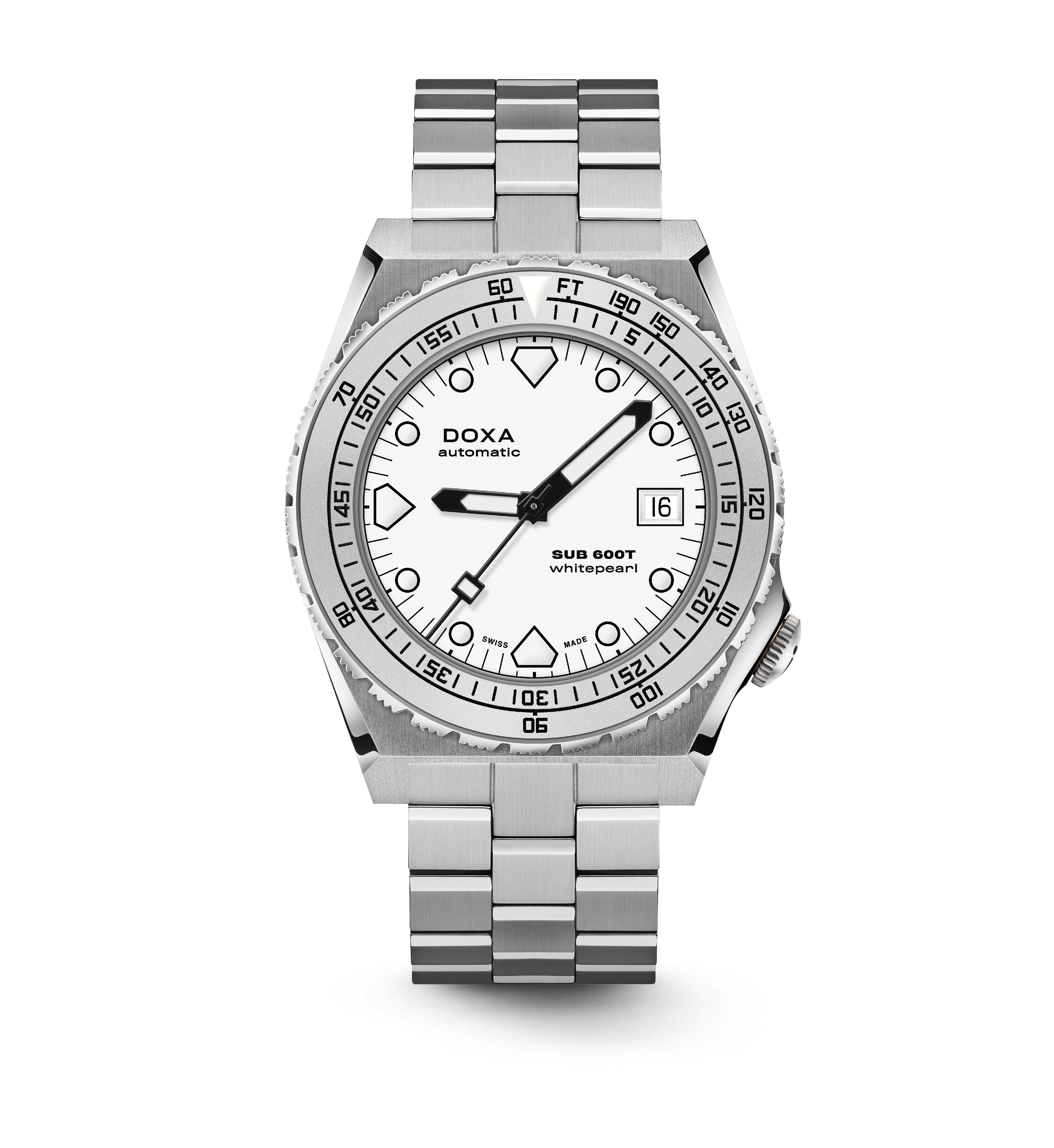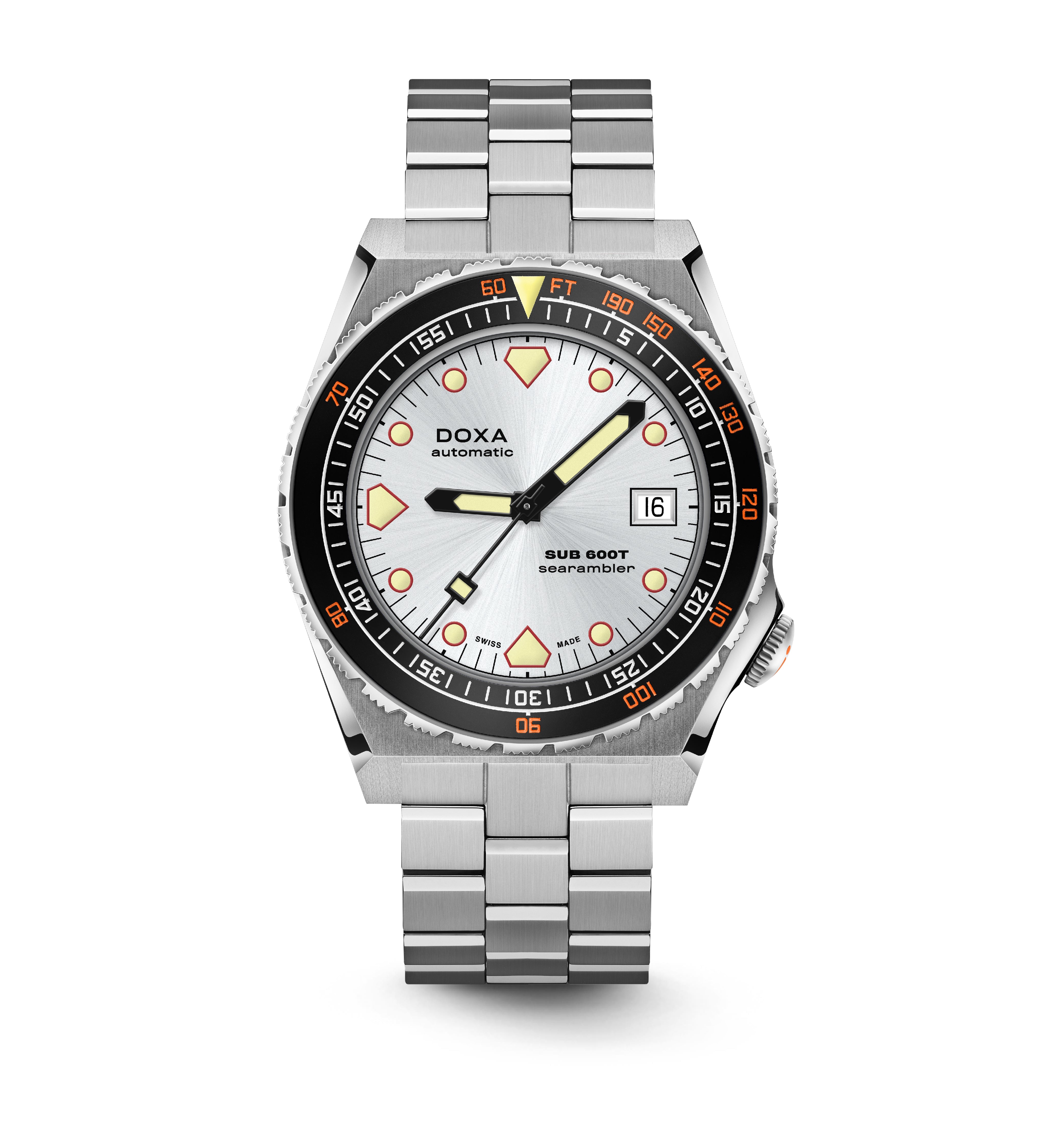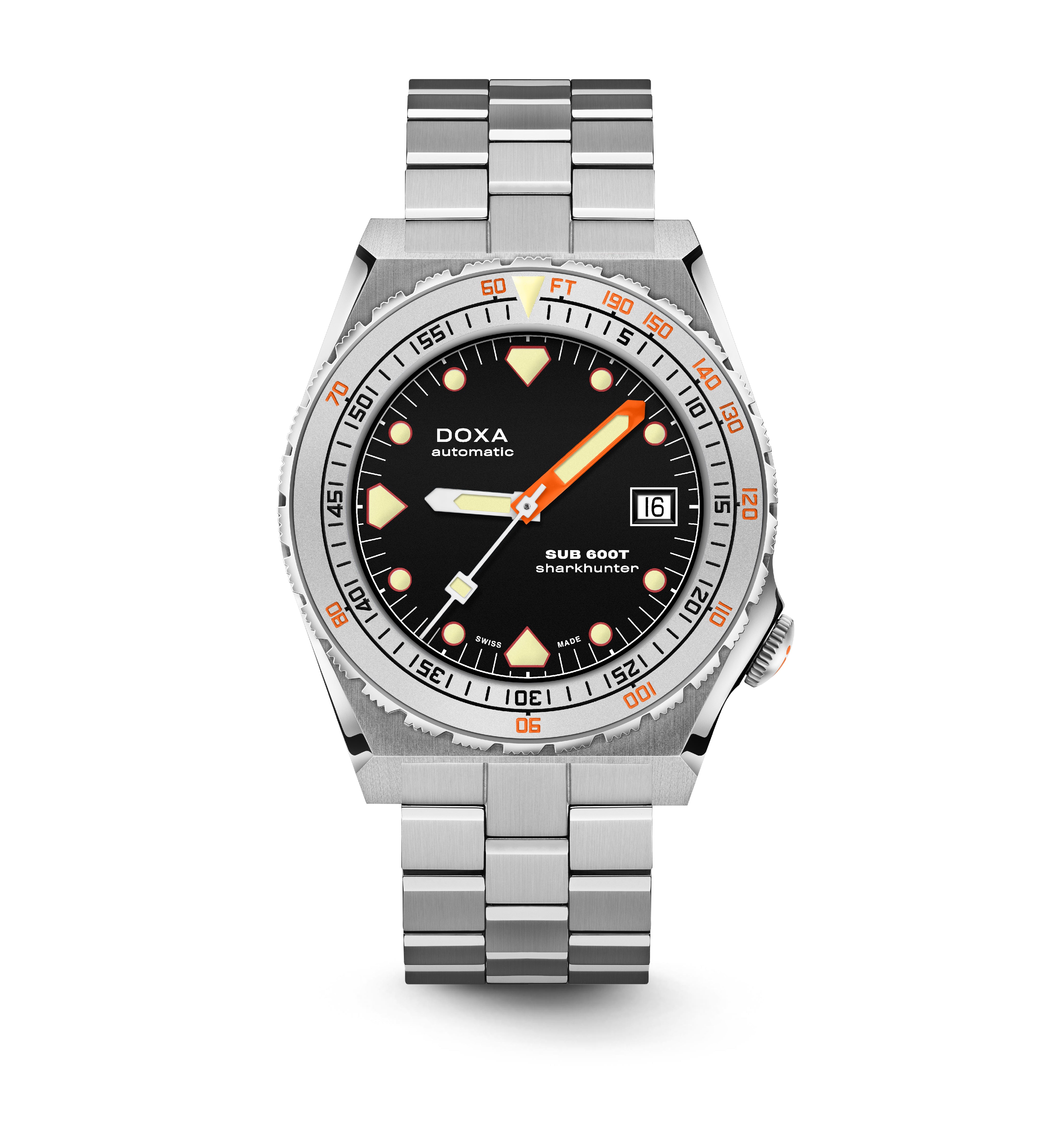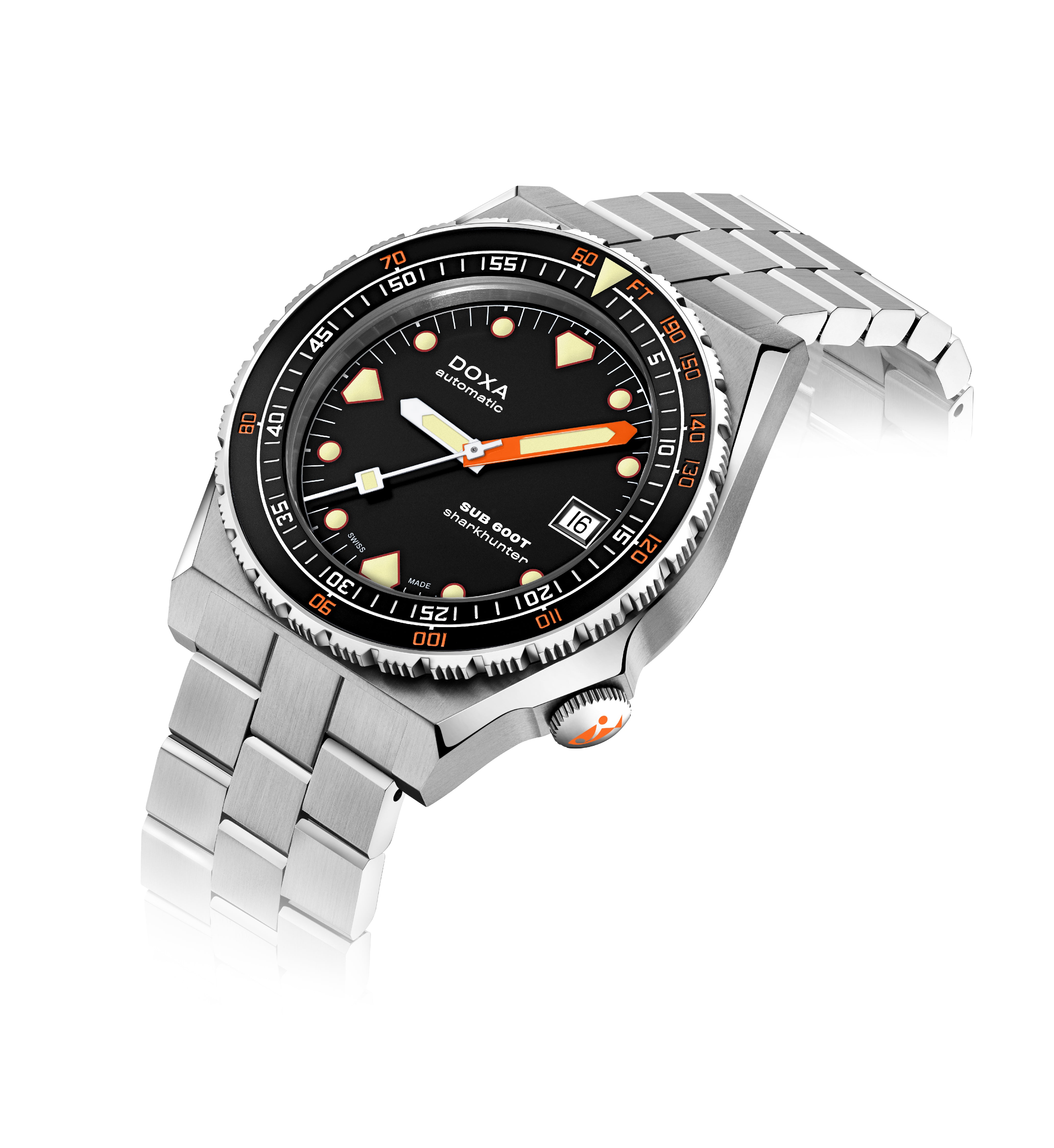 O SUB 600T com 3 mãos e data permanece fiel como sempre à estética do SUB 600T que definiu a DOXA nos anos 80 e se tornou um ícone de sua época. Ao mesmo tempo, ele vem com recursos que o tornam o relógio de mergulhador confiável, desejável e eminentemente usável para hoje.