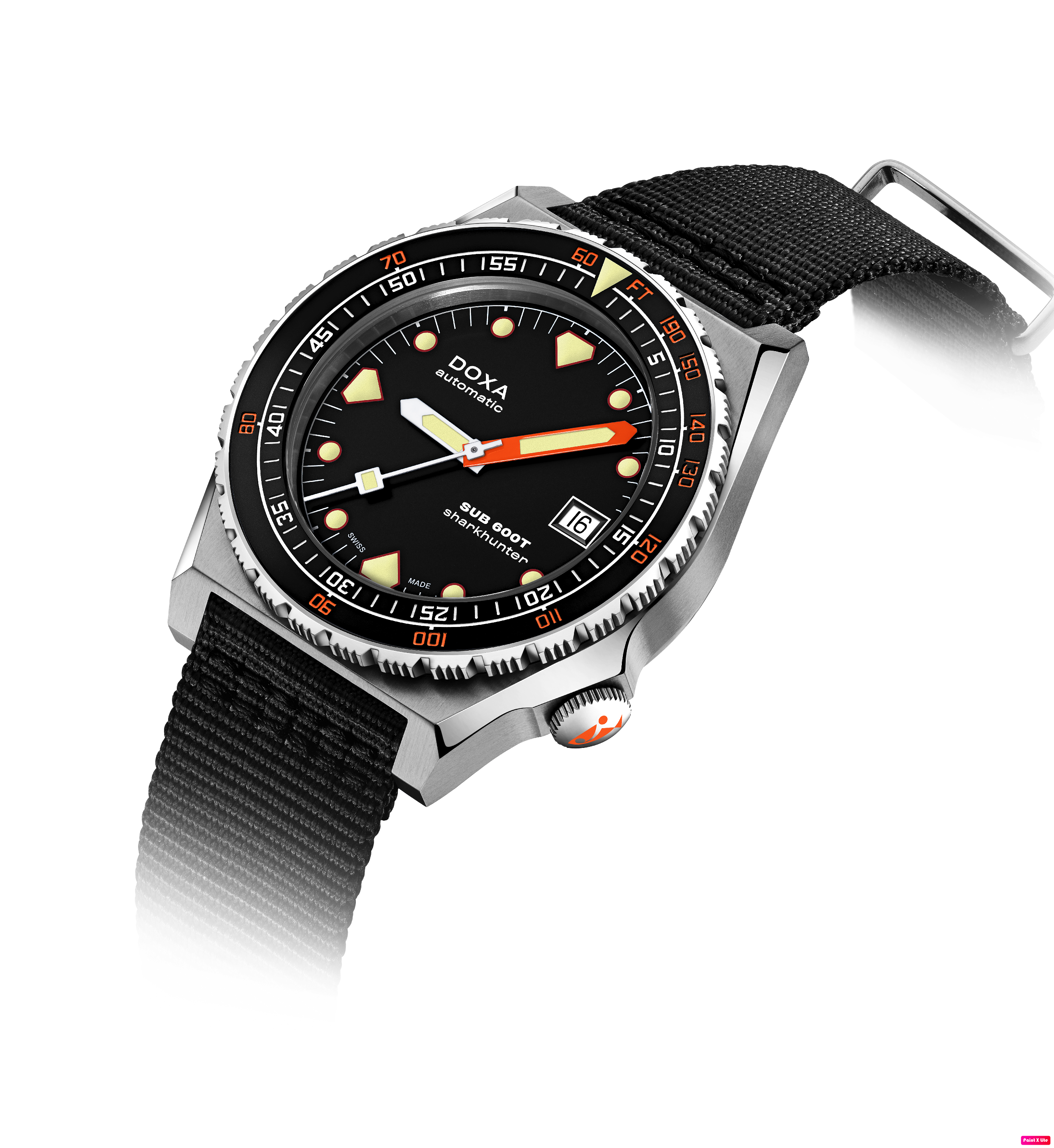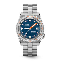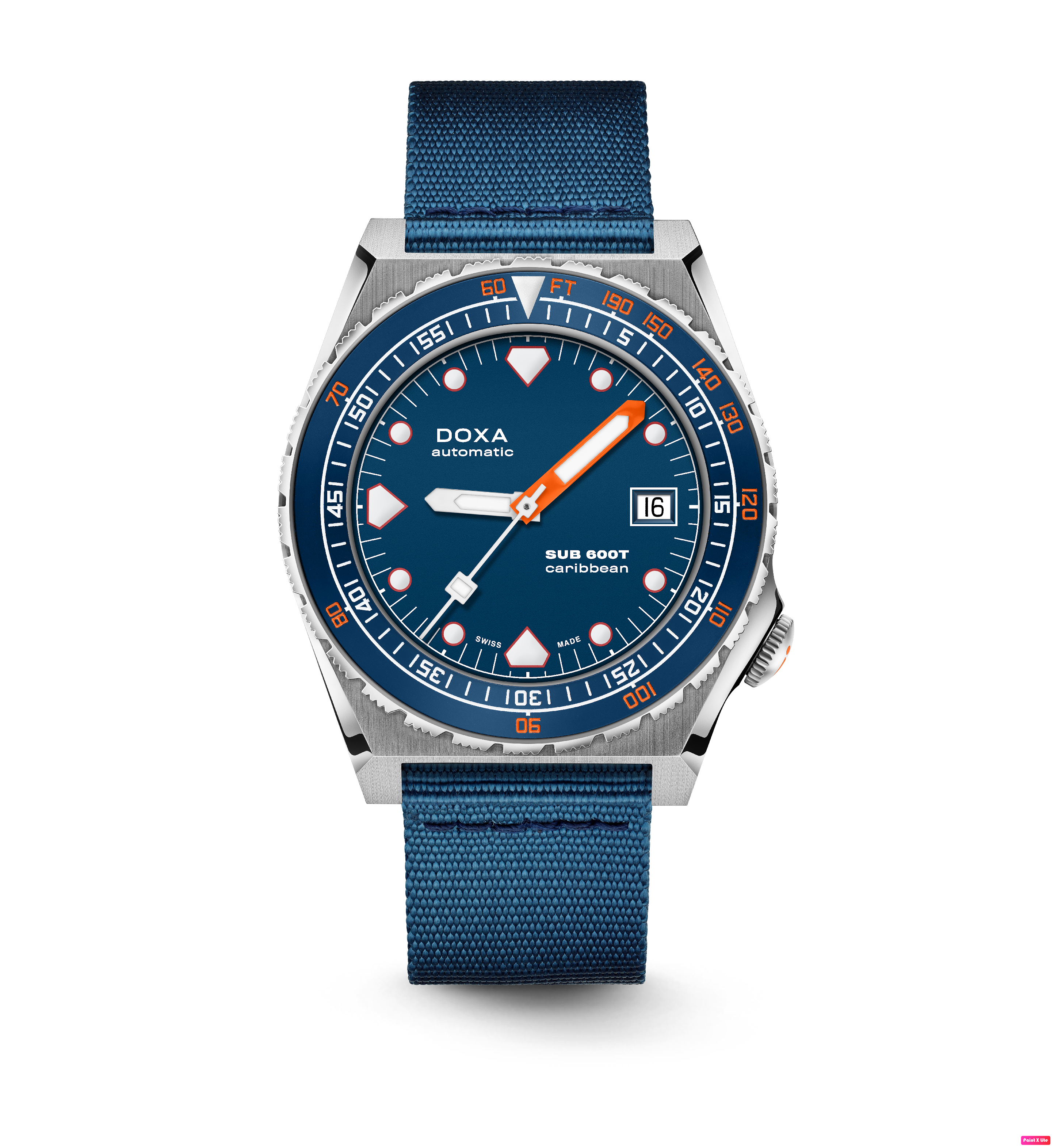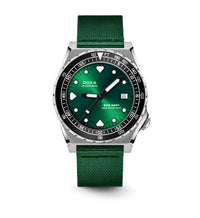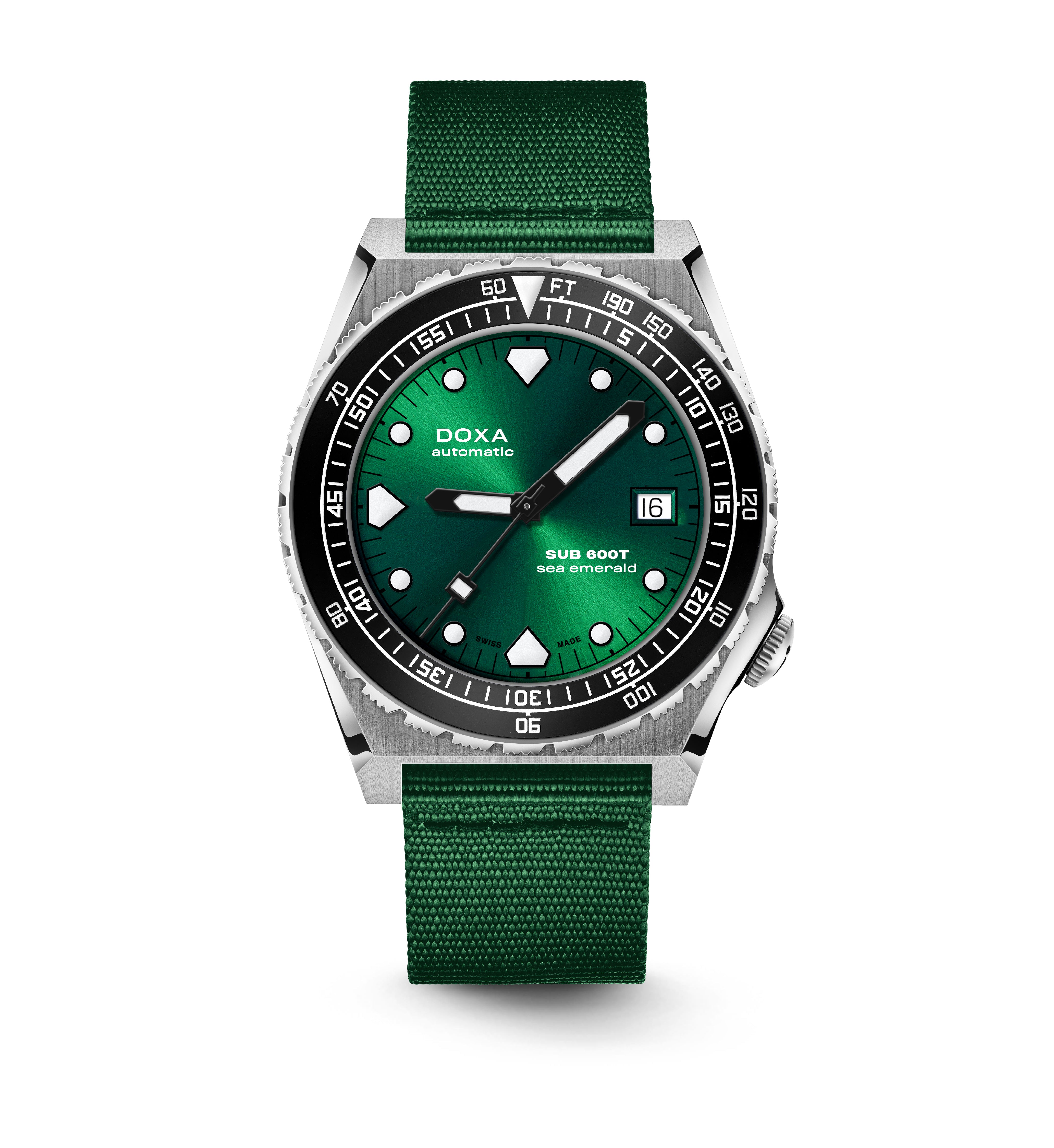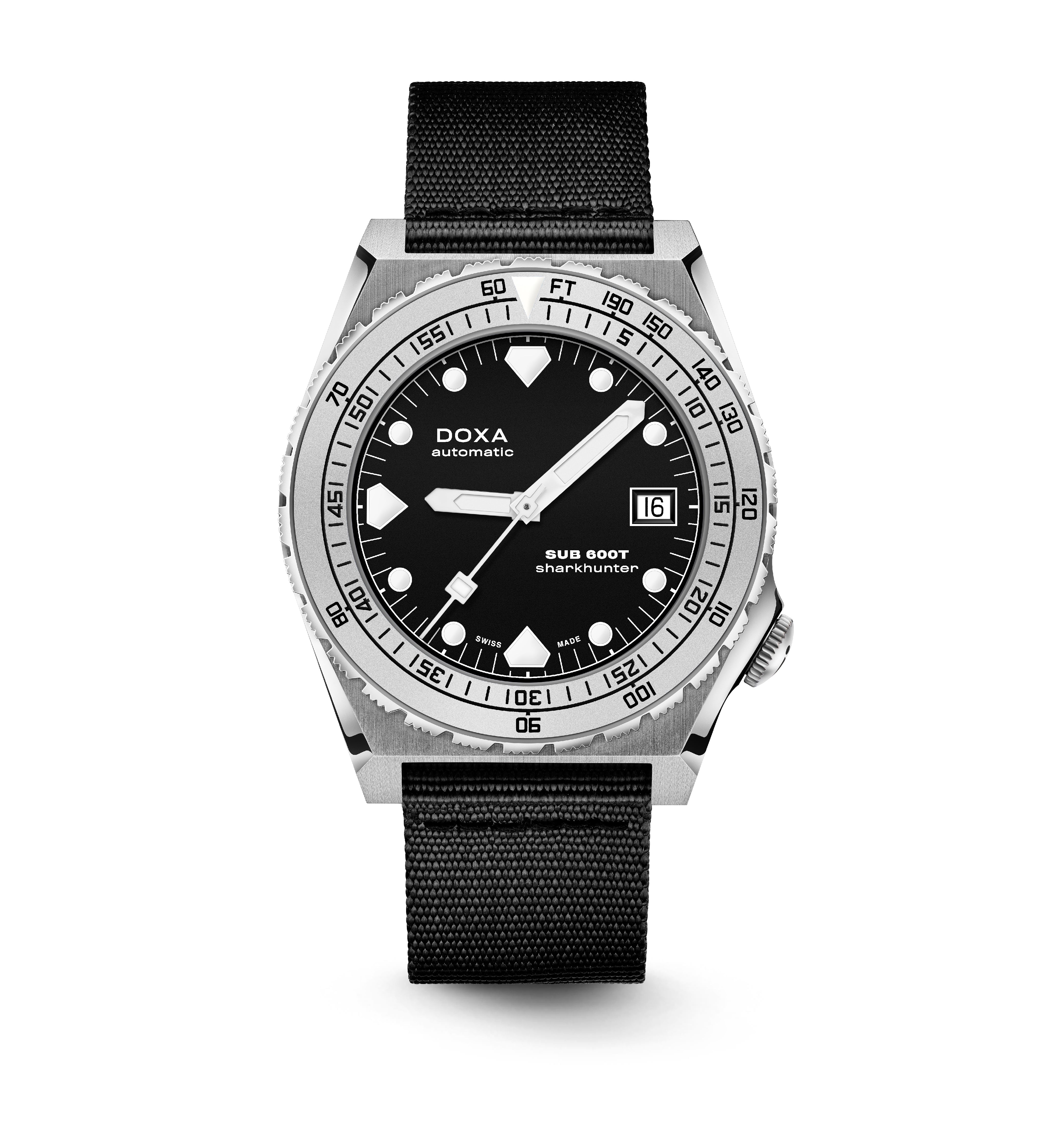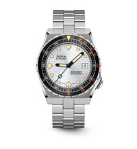 Todas as indicações relacionadas ao mergulho são revestidas com Super-LumiNova® luminescente, incluindo os marcadores distintos de 'dente de tubarão' às 3, 6, 9 e 12 horas, para uma legibilidade ideal em condições de pouca luz. Esta coleção está disponível com uma bracelete estilo NATO tom sobre tom para combinar com a cor do mostrador ou com a nova pulseira de aço inoxidável 316L que traz um toque 'vintage moderno' à coleção DOXA. A bracelete NATO possui uma fivela de pino para um ajuste conveniente e confortável no pulso do proprietário e nas barras de mola de libertação rápida.