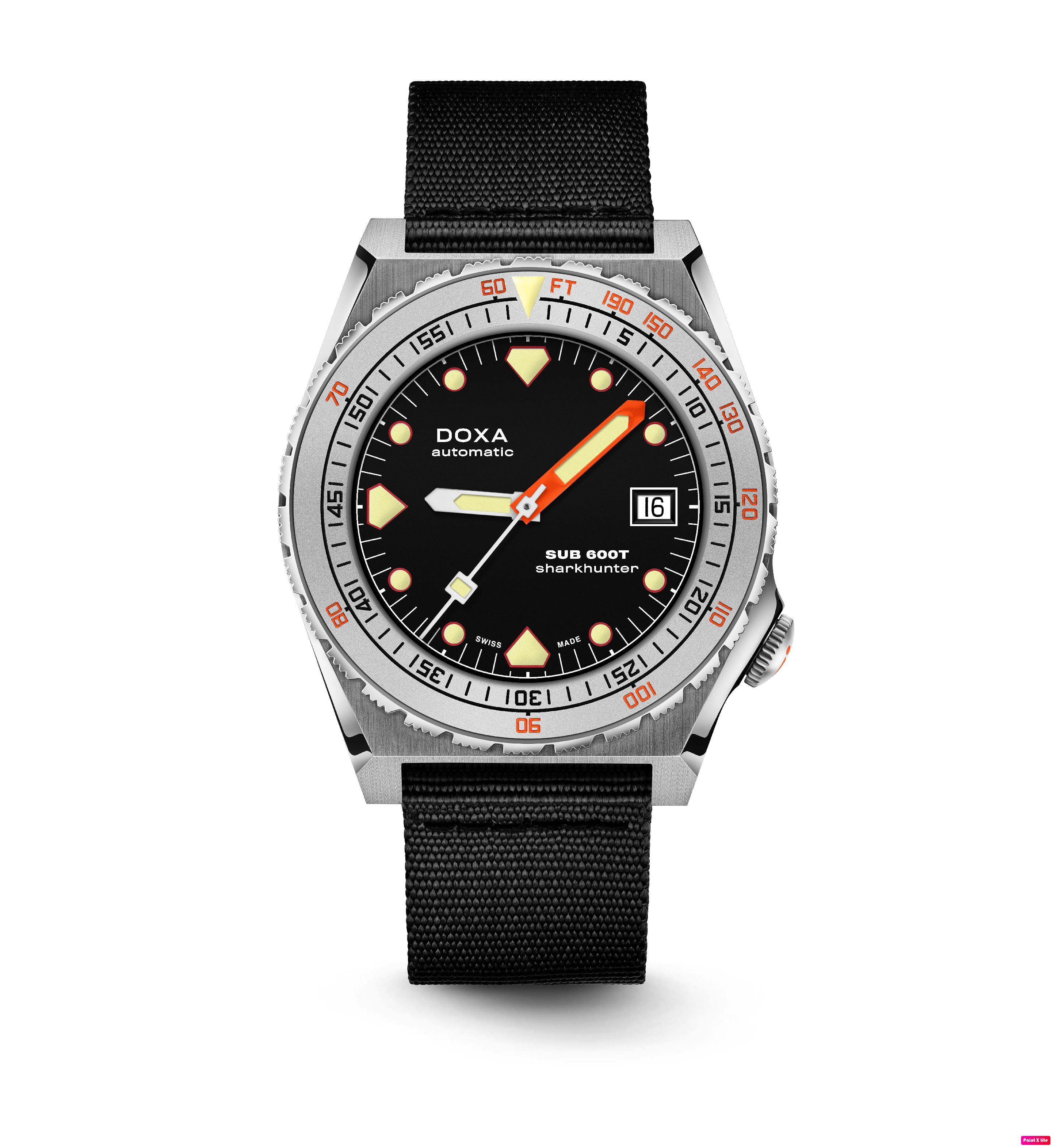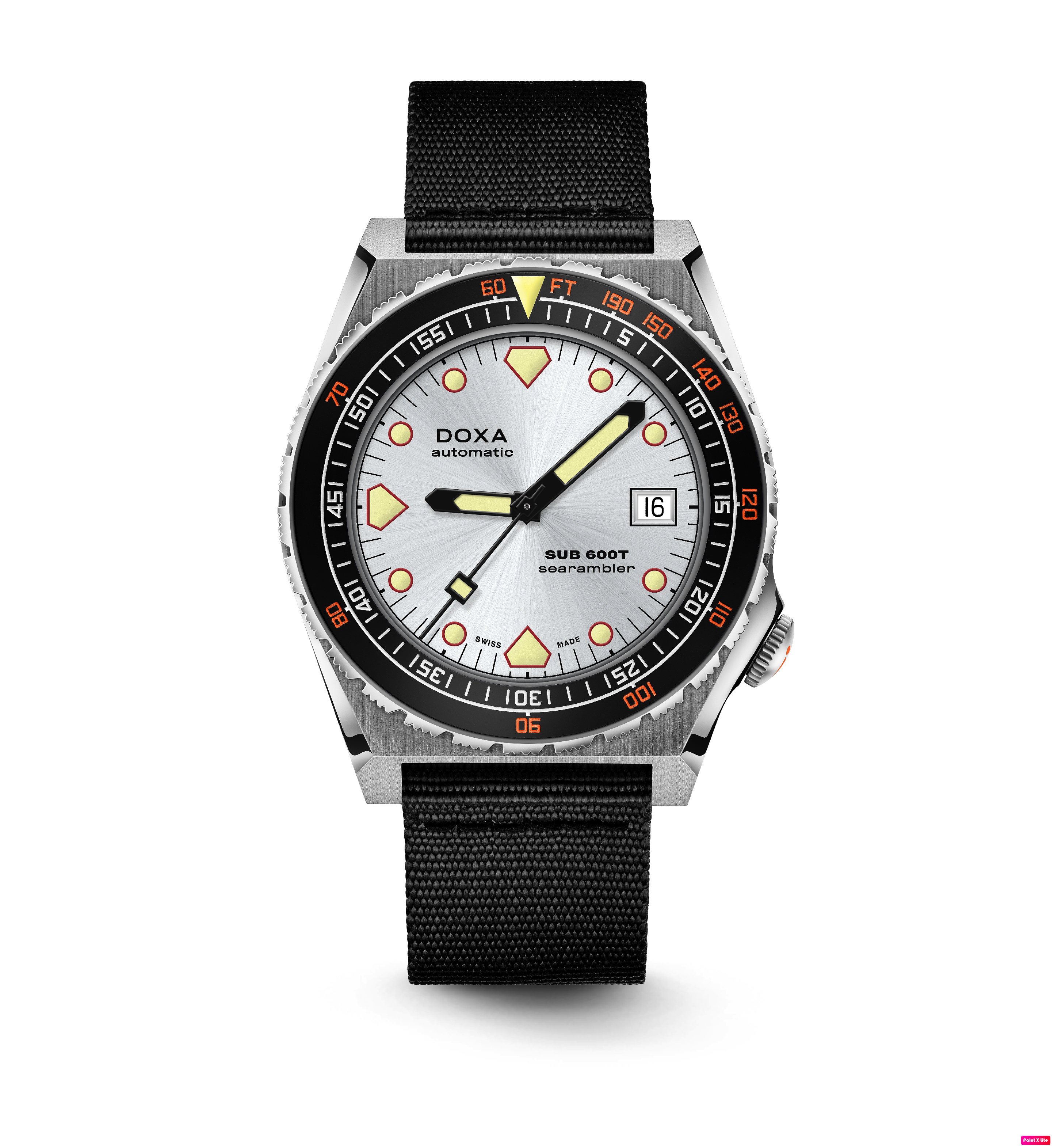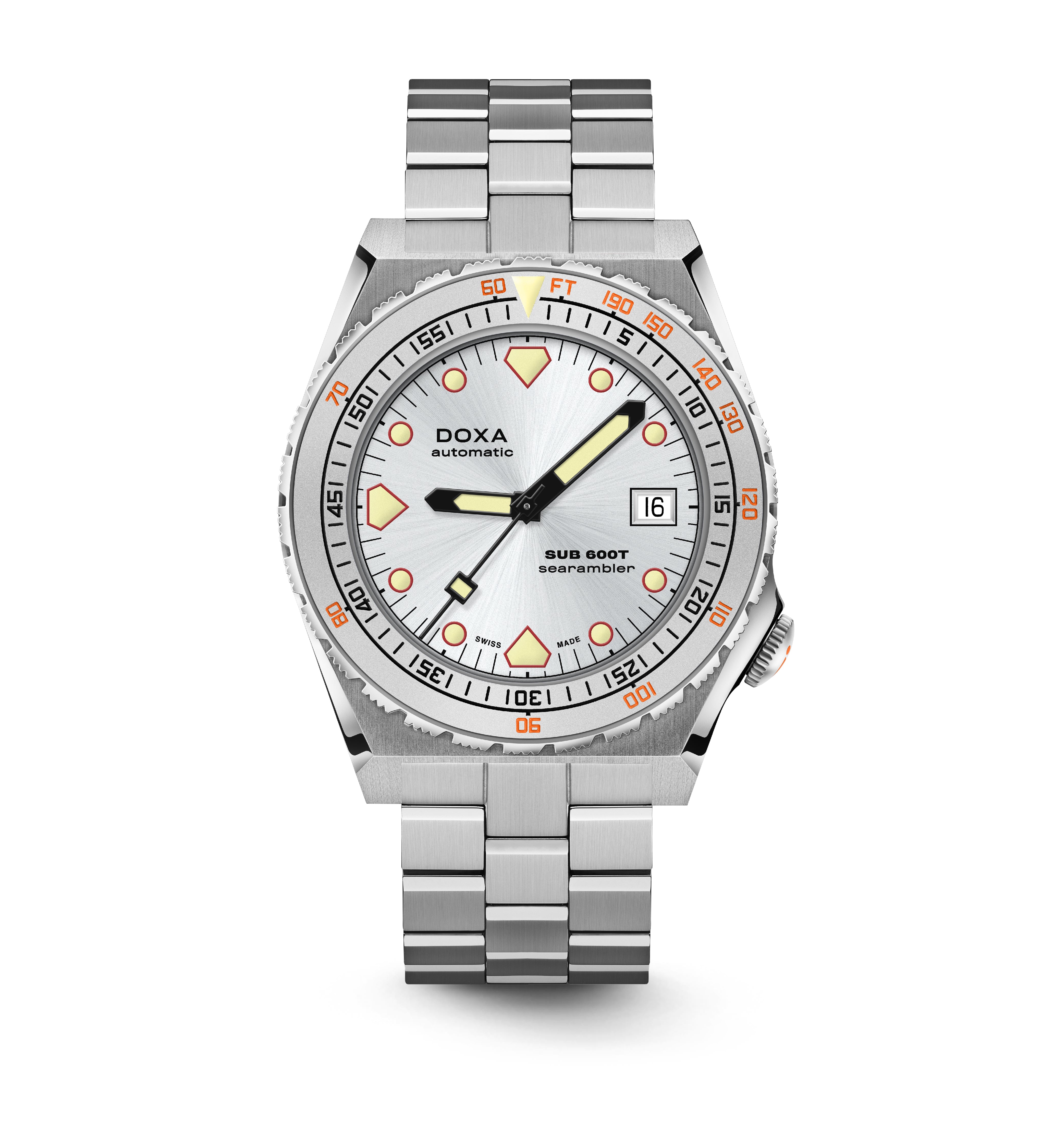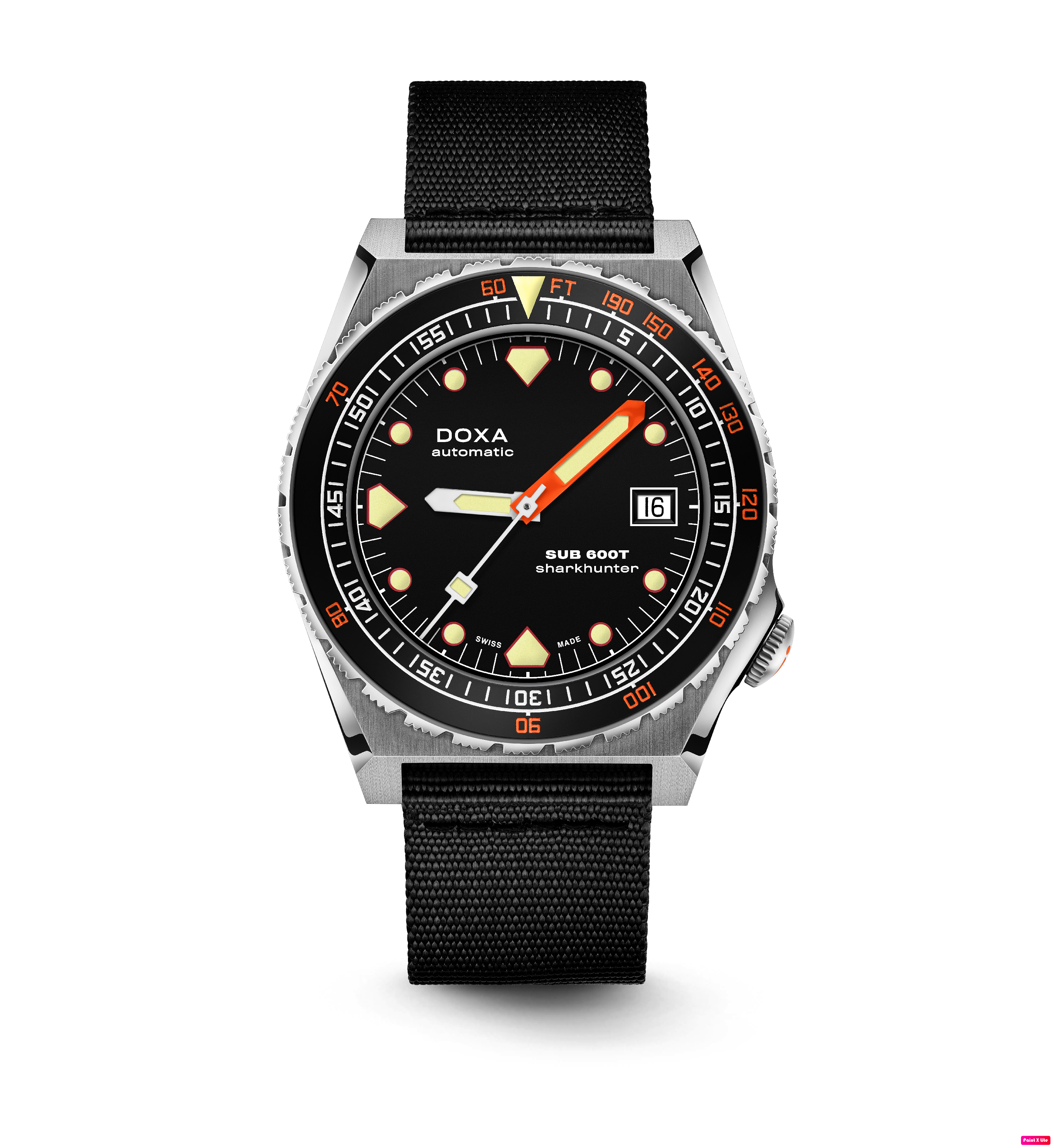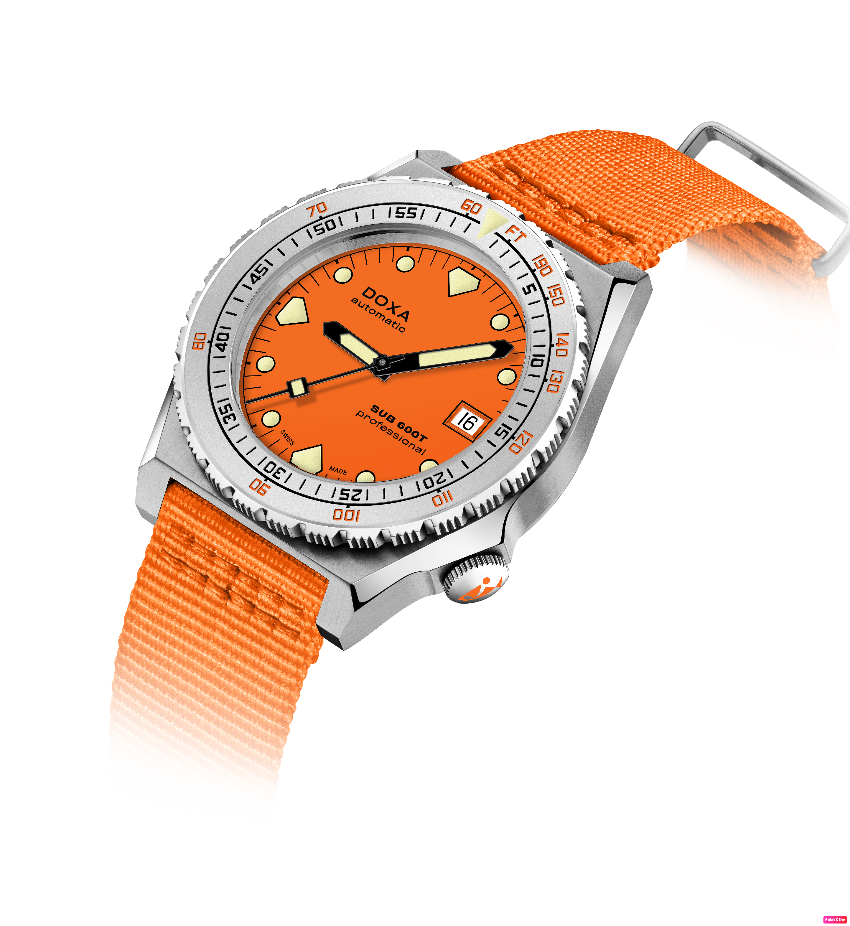 Todas as indicações relacionadas ao mergulho são revestidas com Super-LumiNova® luminescente, incluindo os marcadores distintos de 'dente de tubarão' às 3, 6, 9 e 12 horas, para uma legibilidade ideal em condições de pouca luz. Esta coleção está disponível com uma bracelete estilo NATO tom sobre tom para combinar com a cor do mostrador ou com a nova pulseira de aço inoxidável 316L que traz um toque 'vintage moderno' à coleção DOXA. A bracelete NATO possui uma fivela de pino para um ajuste conveniente e confortável no pulso do proprietário e nas barras de mola de libertação rápida.